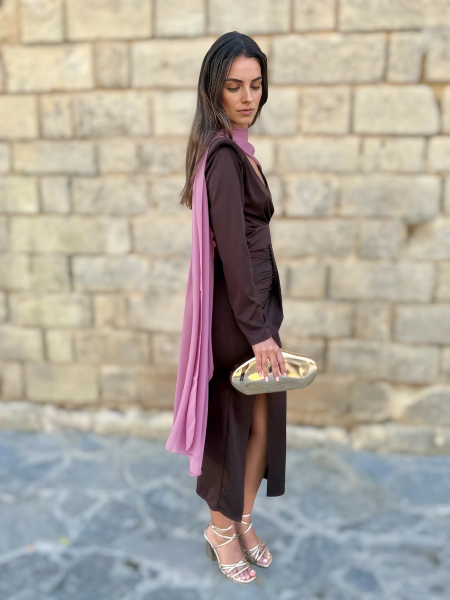 Confeccionada en un tejido vaporoso de textura suave, destaca por su movimiento etéreo y su capacidad para elevar cualquier look de invitada.