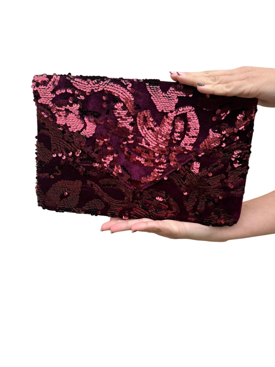 Clutch rectangular con lentejuelas y solapa tipo sobre.