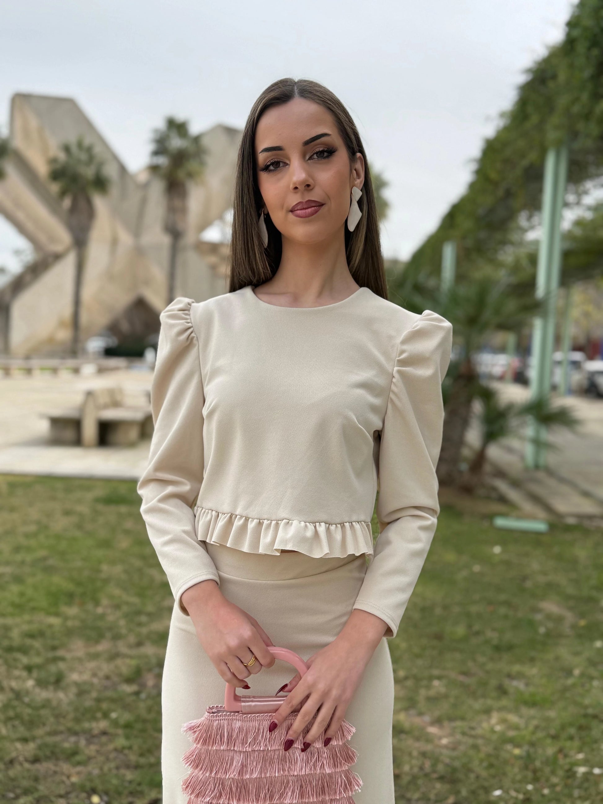 El Conjunto Alana es una propuesta que combina elegancia y sofisticación en una silueta femenina y muy favorecedora. Su parte superior de manga larga, con escote cerrado y hombros ligeramente marcados, aporta estructura y presencia, mientras que el detalle de volante en la cintura define la figura y crea un efecto estilizado muy elegante.