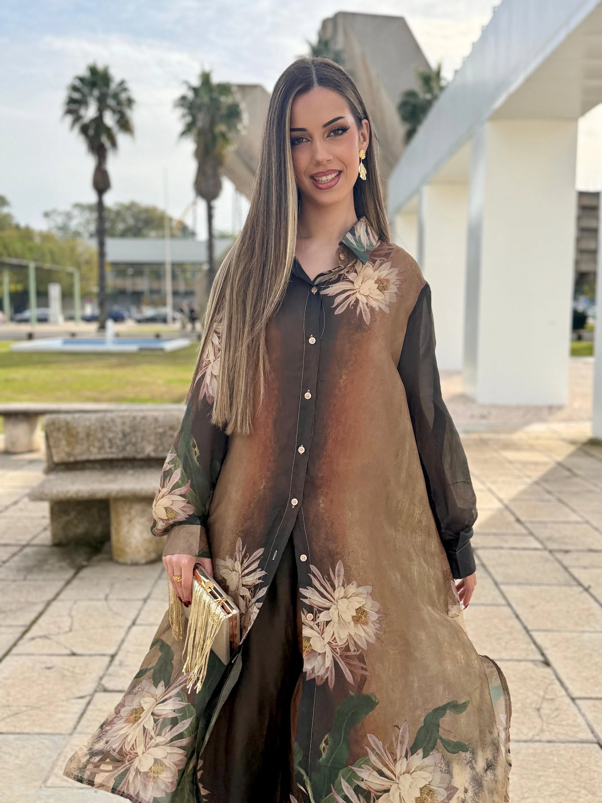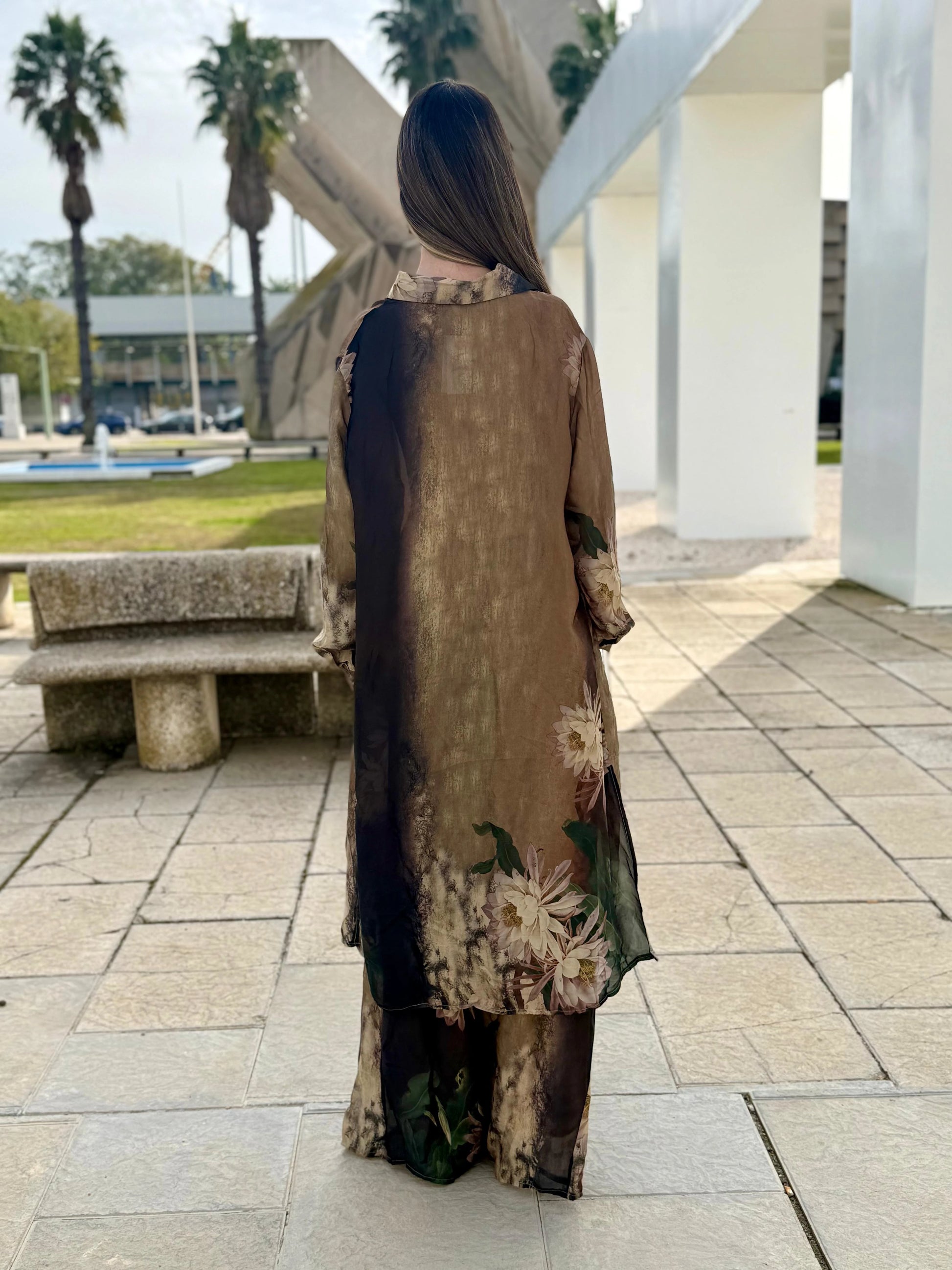 El Conjunto Aria es una propuesta que combina elegancia, ligereza y sofisticación en una silueta fluida y muy favorecedora. Su diseño estampado en tonos suaves y profundos aporta un aire distinguido y femenino, mientras que la camisa de manga larga, con cuello camisero y botonadura frontal, estiliza el conjunto y aporta un acabado refinado.