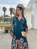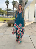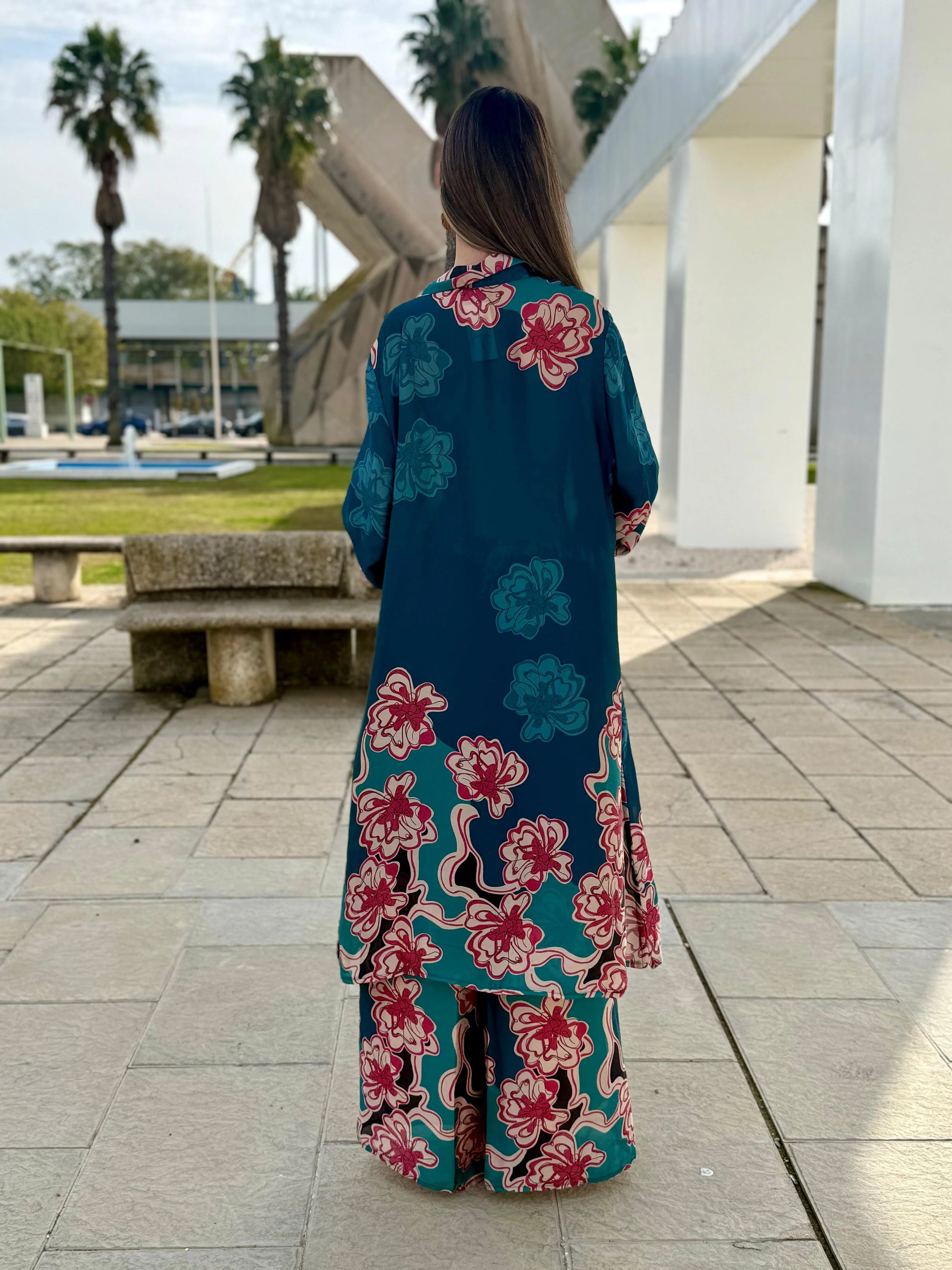 El Conjunto Aria es una propuesta que combina elegancia, ligereza y sofisticación en una silueta fluida y muy favorecedora. Su diseño estampado en tonos suaves y profundos aporta un aire distinguido y femenino, mientras que la camisa de manga larga, con cuello camisero y botonadura frontal, estiliza el conjunto y aporta un acabado refinado.