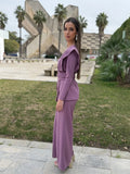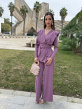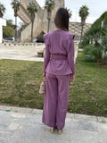 El cinturón del mismo tejido define la cintura y equilibra el conjunto, mientras que el pantalón de pierna ancha alarga visualmente la silueta y aporta movimiento al caminar. Confeccionado en un tejido de caída suave, este diseño resulta cómodo, femenino y perfecto para quienes buscan un look pulido y especial.