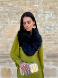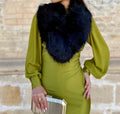Confeccionado en un pelo sintético de tacto sedoso, ofrece una sensación cálida y ligera, manteniendo un aspecto lujoso y muy femenino. Su estructura compacta permite colocarlo con facilidad sobre vestidos, abrigos o chaquetas, añadiendo volumen y riqueza visual sin recargar el conjunto.