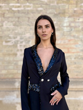 El Mono Manuela es una prenda que desprende fuerza, elegancia y modernidad en partes iguales. Inspirado en el estilo esmoquin, presenta un diseño estructurado con solapas adornadas con lentejuelas que aportan un toque de brillo sofisticado, perfecto para destacar en los eventos más especiales.