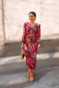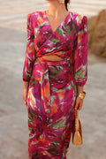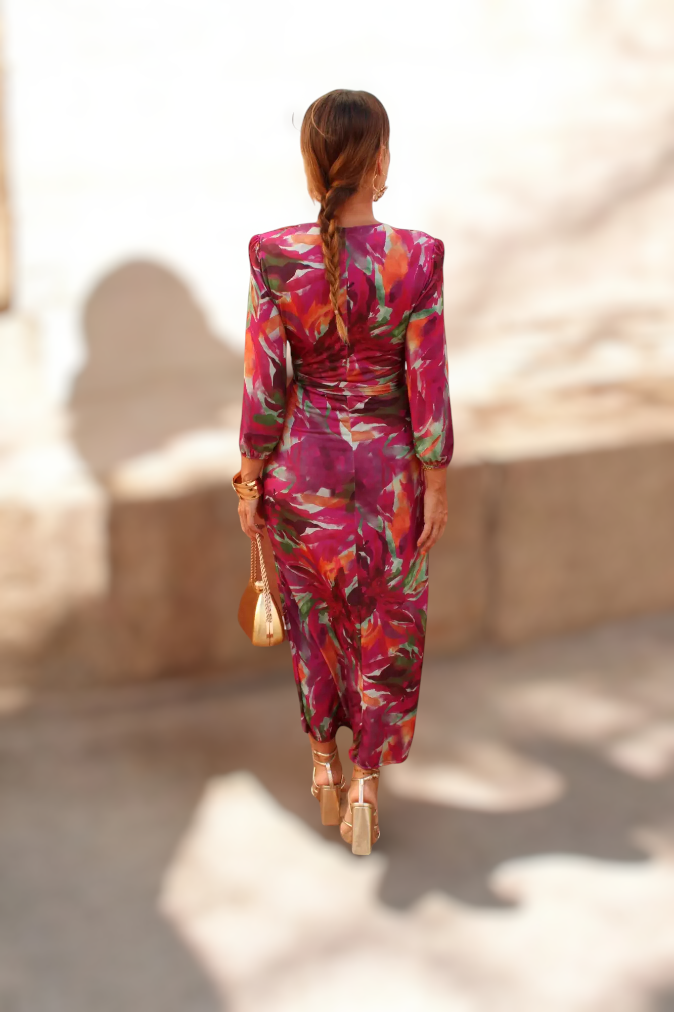 Confeccionado en un tejido vaporoso y ligero, su caída fluida acompaña el movimiento con elegancia y frescura. El estampado acuarelado en tonos rosa, buganvilla, verde y coral llena el look de energía y vitalidad, ideal para destacar en eventos de día o celebraciones al aire libre.