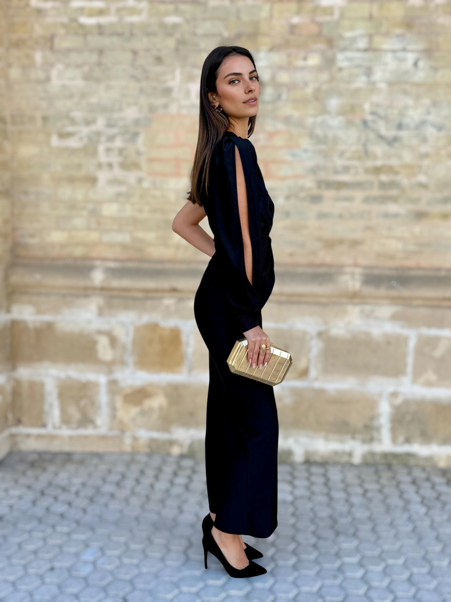 El tono negro transmite sofisticación, seguridad y atemporalidad, convirtiendo este diseño en una opción perfecta para invitadas que buscan destacar con elegancia discreta y estilo impecable.