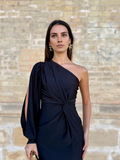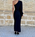 El Vestido Aitana Negro es una pieza elegante y sofisticada que combina sensualidad y distinción en un diseño asimétrico único. Su escote de un solo hombro aporta un aire moderno y refinado, mientras que la manga con caída fluida y abertura lateral añade movimiento y un toque de elegancia contemporánea.
