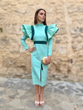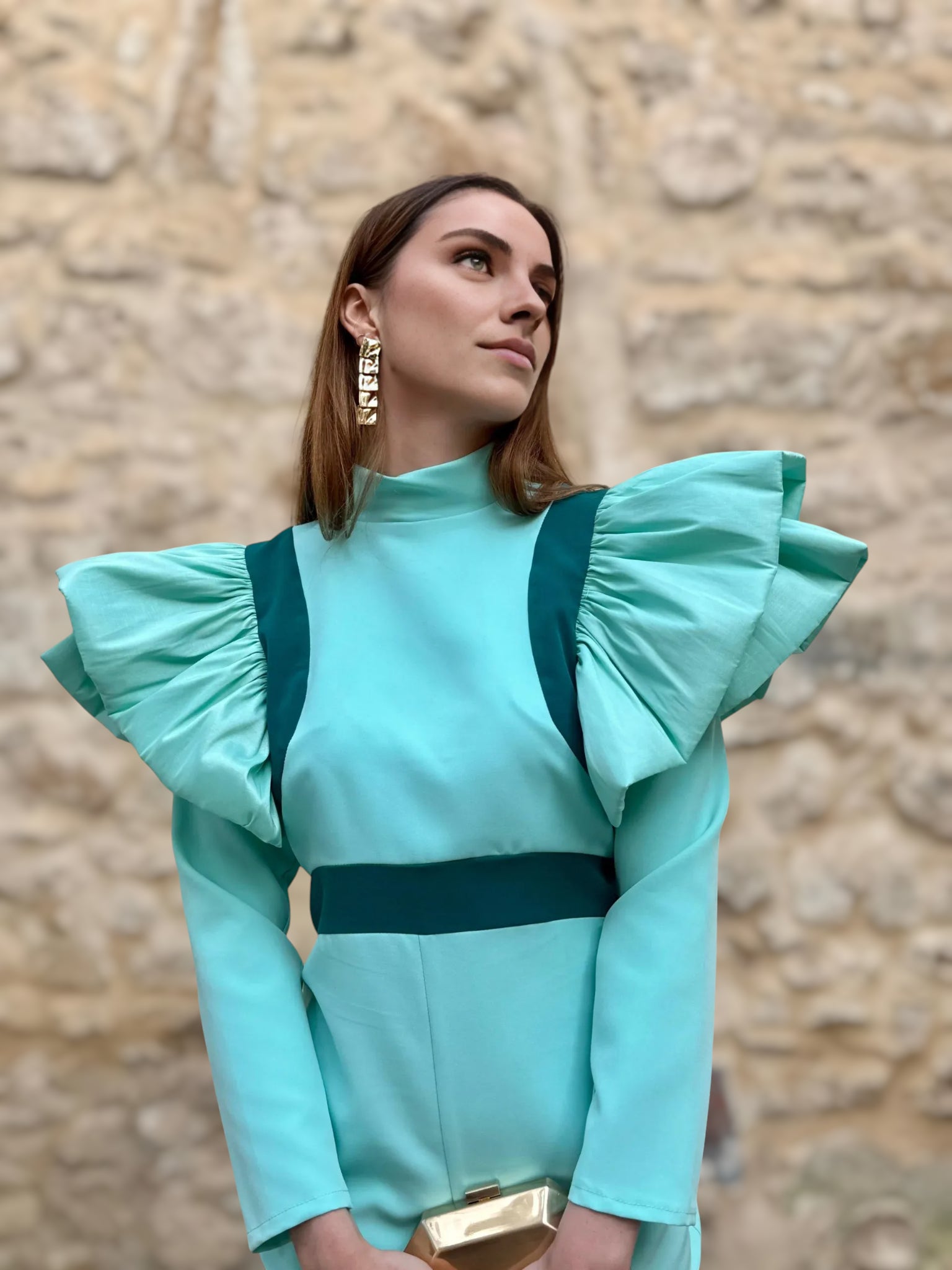 El Vestido Amaia Agua Marina es una creación sofisticada y original que destaca por su diseño estructurado y sus volúmenes cuidadosamente estudiados. Su cuello cerrado y las mangas largas con maxi volantes en los hombros aportan fuerza y elegancia, creando una silueta poderosa y muy femenina.