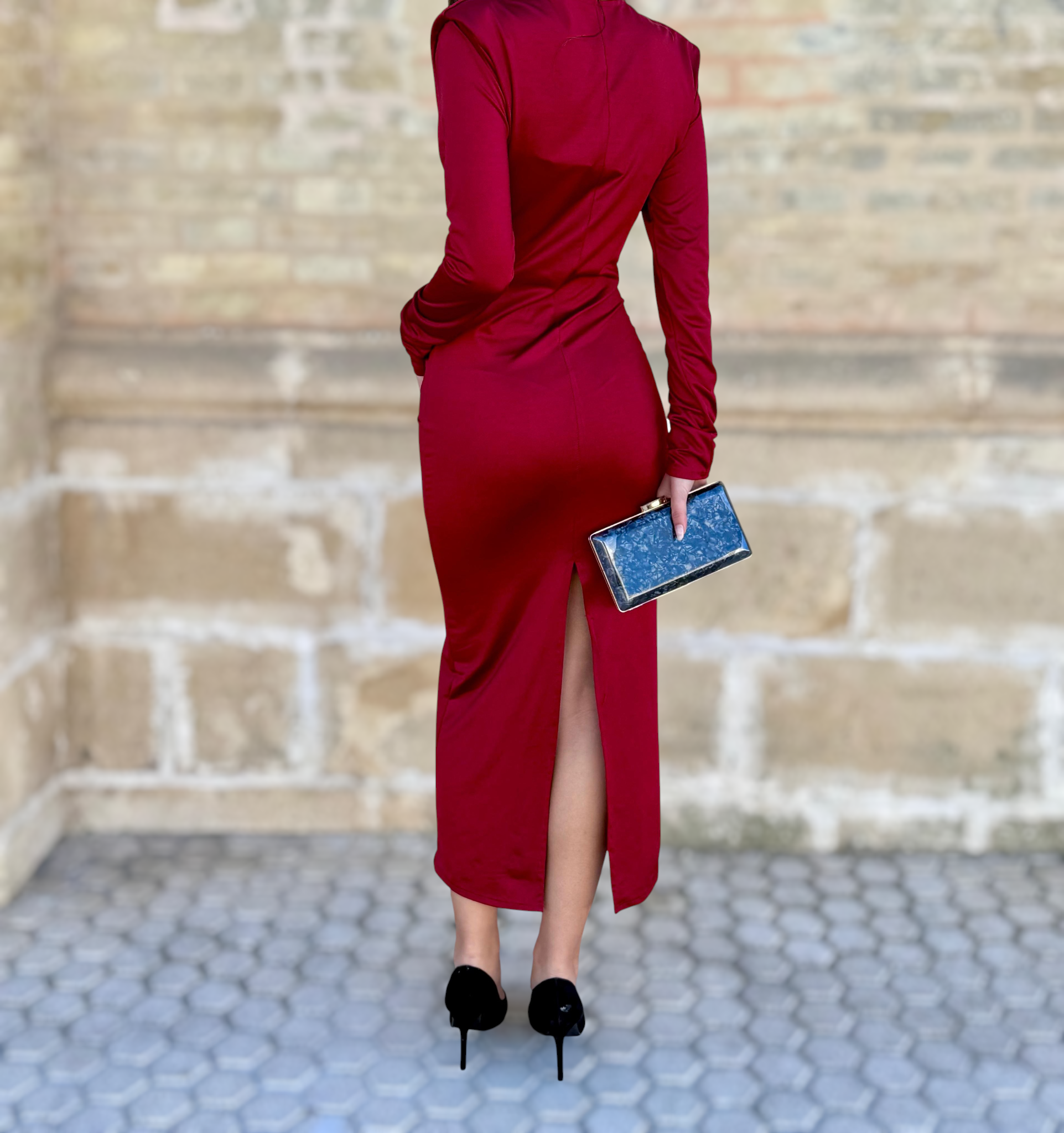 El tono granate profundo transmite carácter y distinción, aportando un aire elegante y sofisticado que realza cualquier look de invitada.
