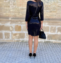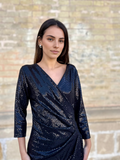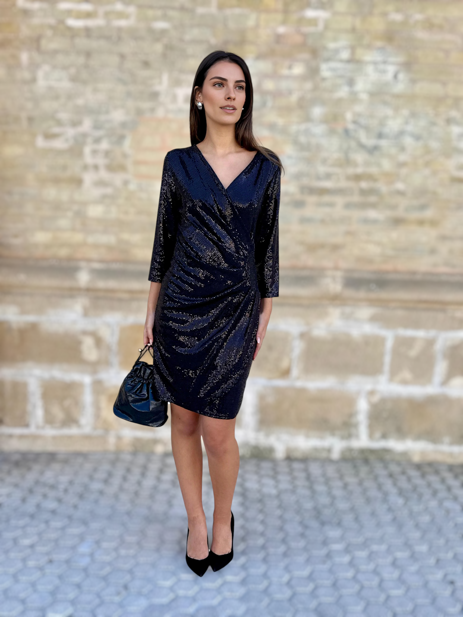 Confeccionado en un tejido cubierto de lentejuelas finas, este vestido corto aporta un efecto luminoso y dinámico sin resultar excesivo. Las mangas tres cuartos equilibran el diseño y añaden un toque refinado, perfecto para eventos de noche.