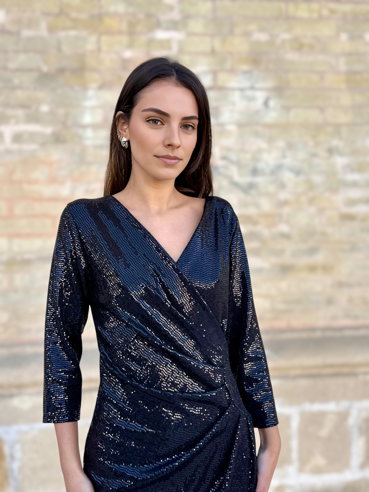 El Vestido Armonía Negro es una pieza de fiesta sofisticada que combina brillo y elegancia en un diseño muy favorecedor. Su escote en pico cruzado estiliza el cuello y realza el busto con sutileza, mientras que el drapeado frontal crea una silueta envolvente que potencia la figura con naturalidad.
