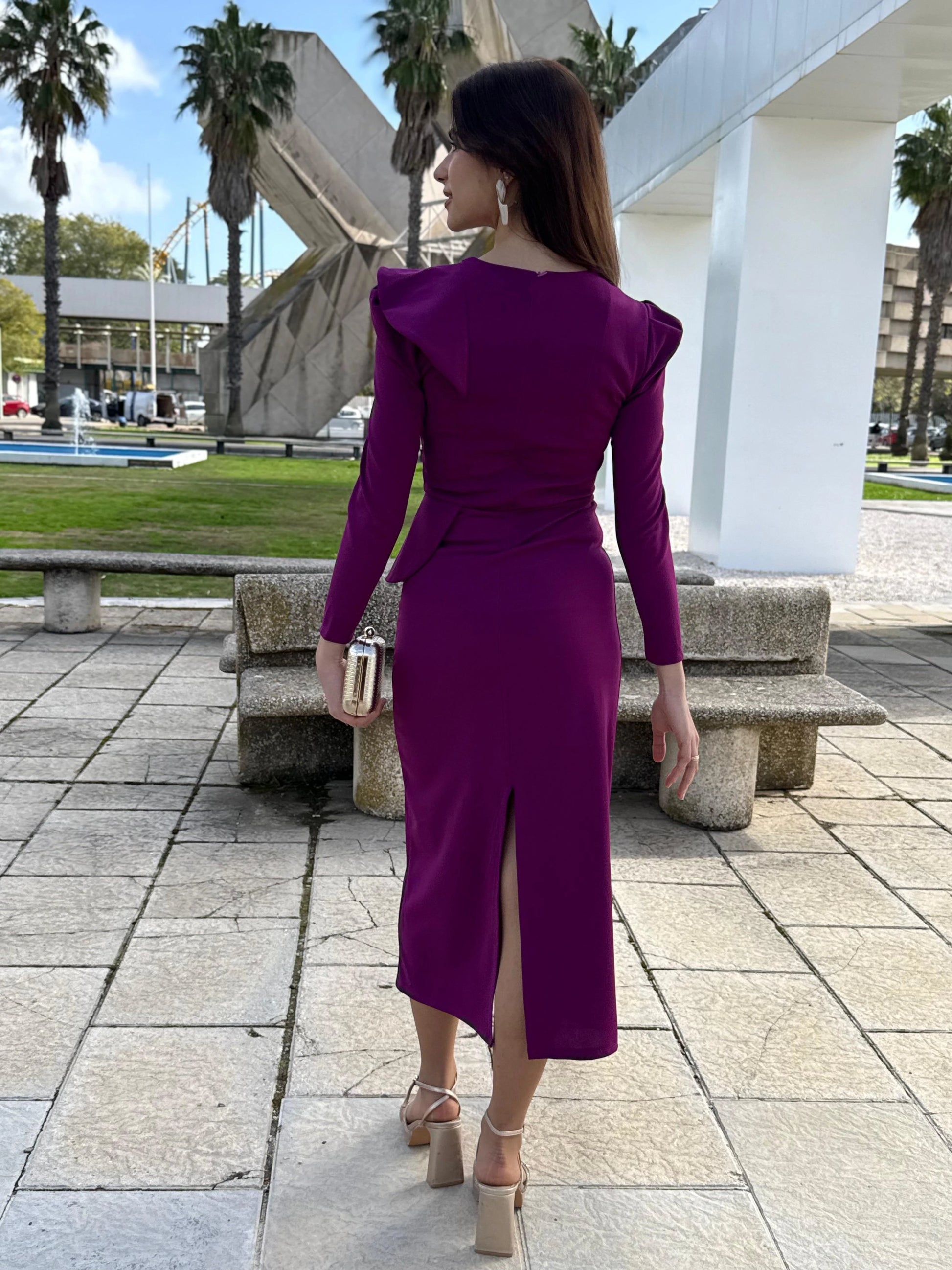 El escote cerrado y las mangas largas equilibran la silueta, aportando sobriedad y elegancia, mientras que su corte entallado en la cintura define la figura con delicadeza. La falda de largo midi y silueta recta estiliza visualmente y garantiza una caída impecable que acompaña el movimiento con naturalidad.