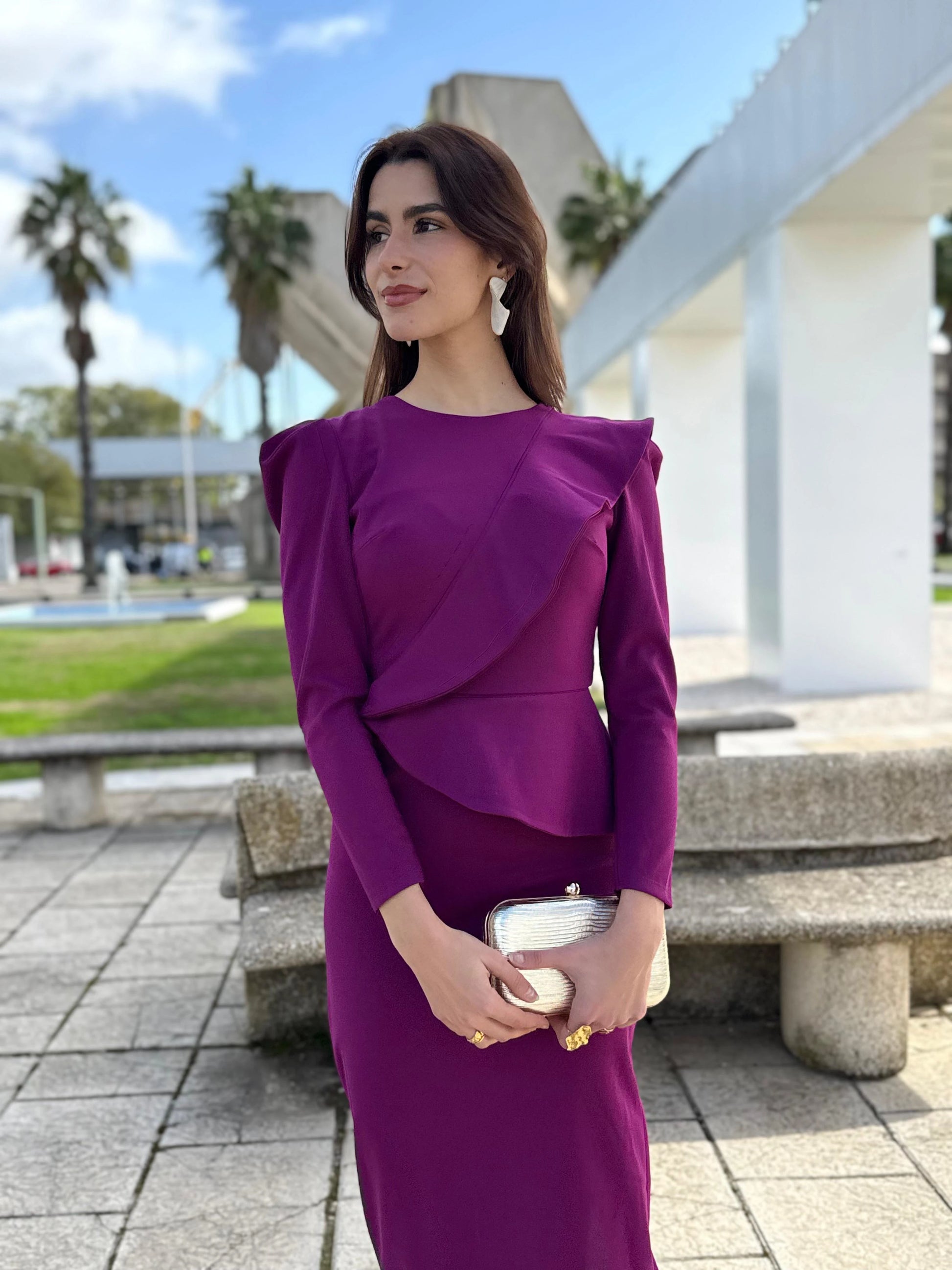 El Vestido Aura es una pieza sofisticada y poderosa que destaca por su intenso tono buganvilla, símbolo de elegancia, seguridad y feminidad. Su diseño de líneas limpias se realza con un volante asimétrico en el delantero que aporta movimiento y un detalle distintivo, elevando el conjunto con un aire contemporáneo y refinado.