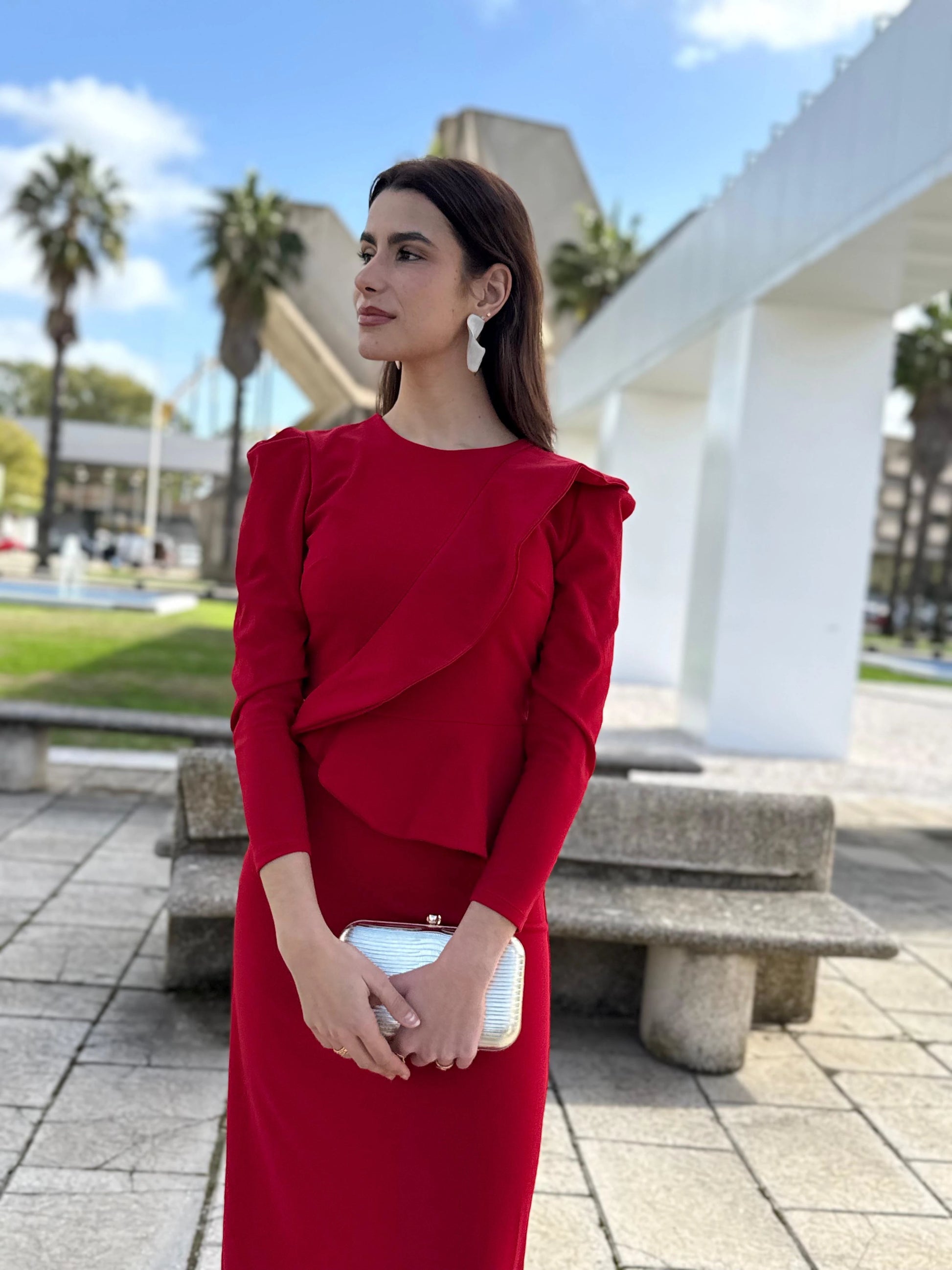 El Vestido Aura es una pieza sofisticada y poderosa que destaca por su intenso tono rojo, símbolo de elegancia, seguridad y feminidad. Su diseño de líneas limpias se realza con un volante asimétrico en el delantero que aporta movimiento y un detalle distintivo, elevando el conjunto con un aire contemporáneo y refinado.