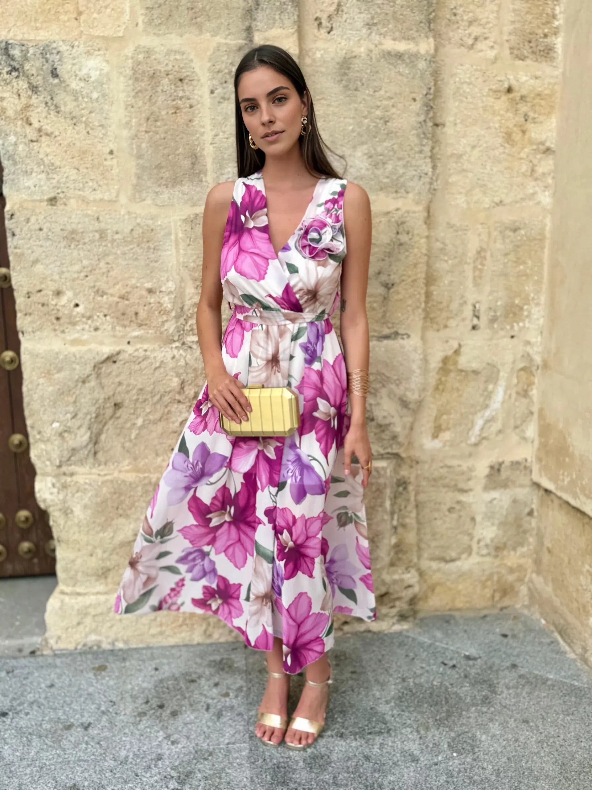El Vestido Beatriz Rosa Fucsia es una pieza vibrante y elegante que combina feminidad y frescura en un diseño de inspiración floral. Su escote cruzado en pico realza el busto con delicadeza, mientras que la falda midi de vuelo ligero aporta movimiento y una silueta armoniosa.