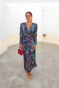 El Vestido Candela Estampado es perfecto como vestido de invitada o de fiesta, una opción única para quienes buscan un look sofisticado, original y lleno de luz.