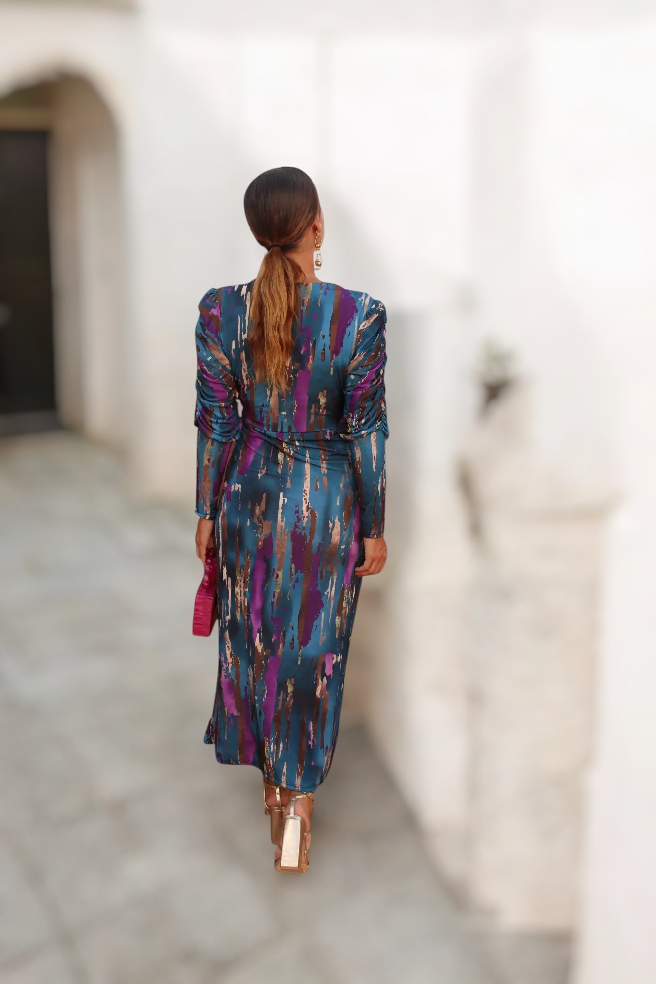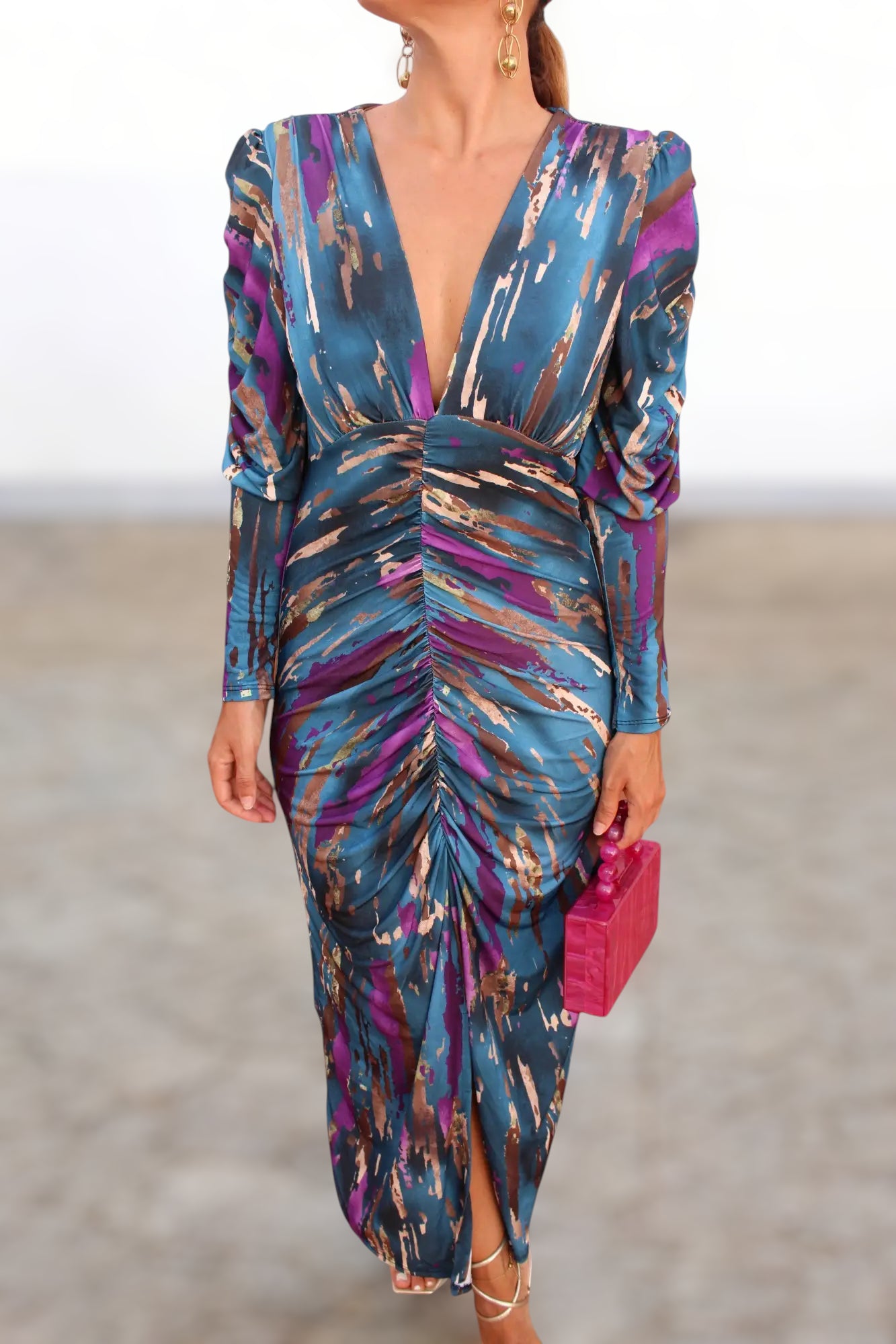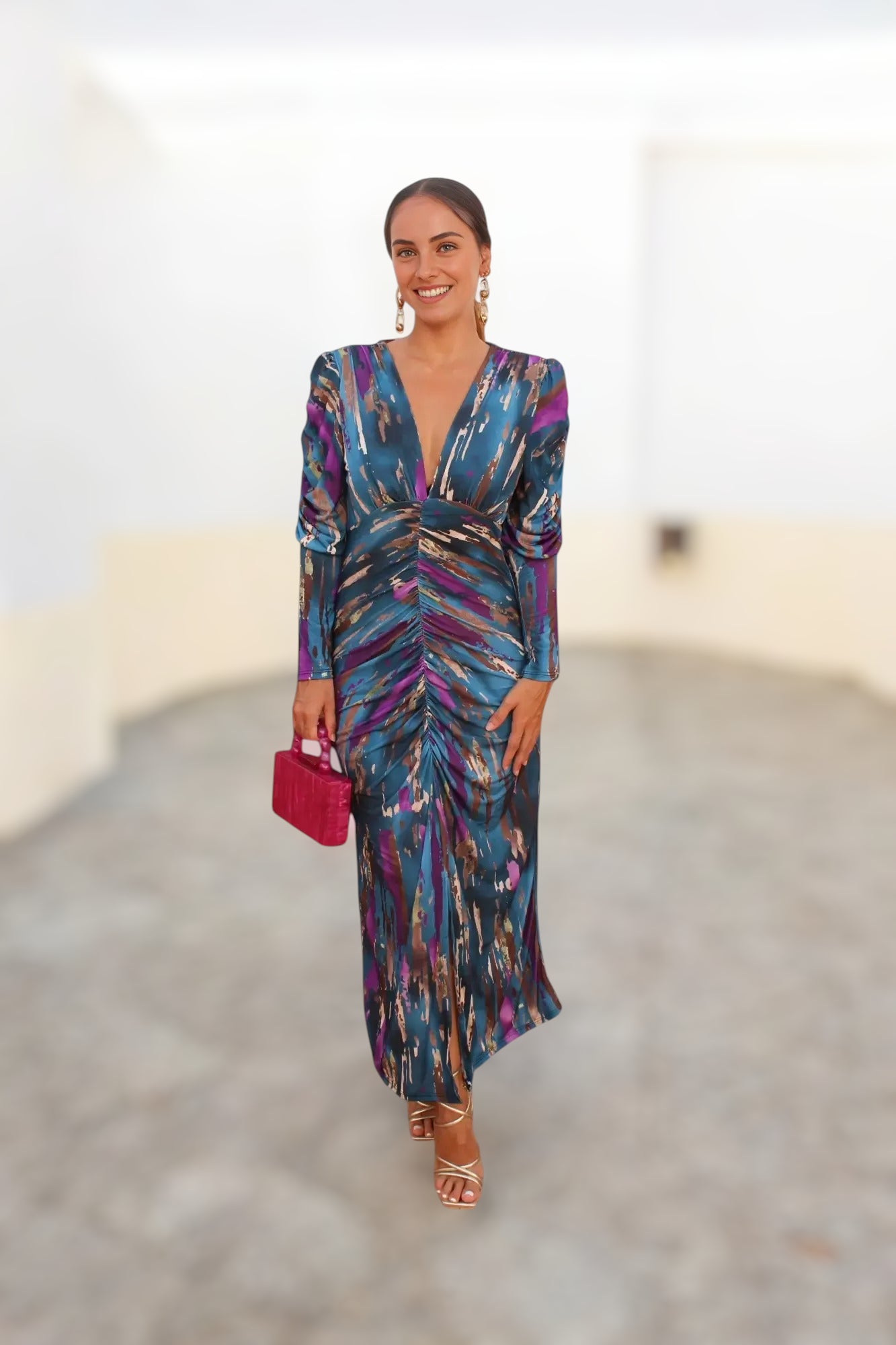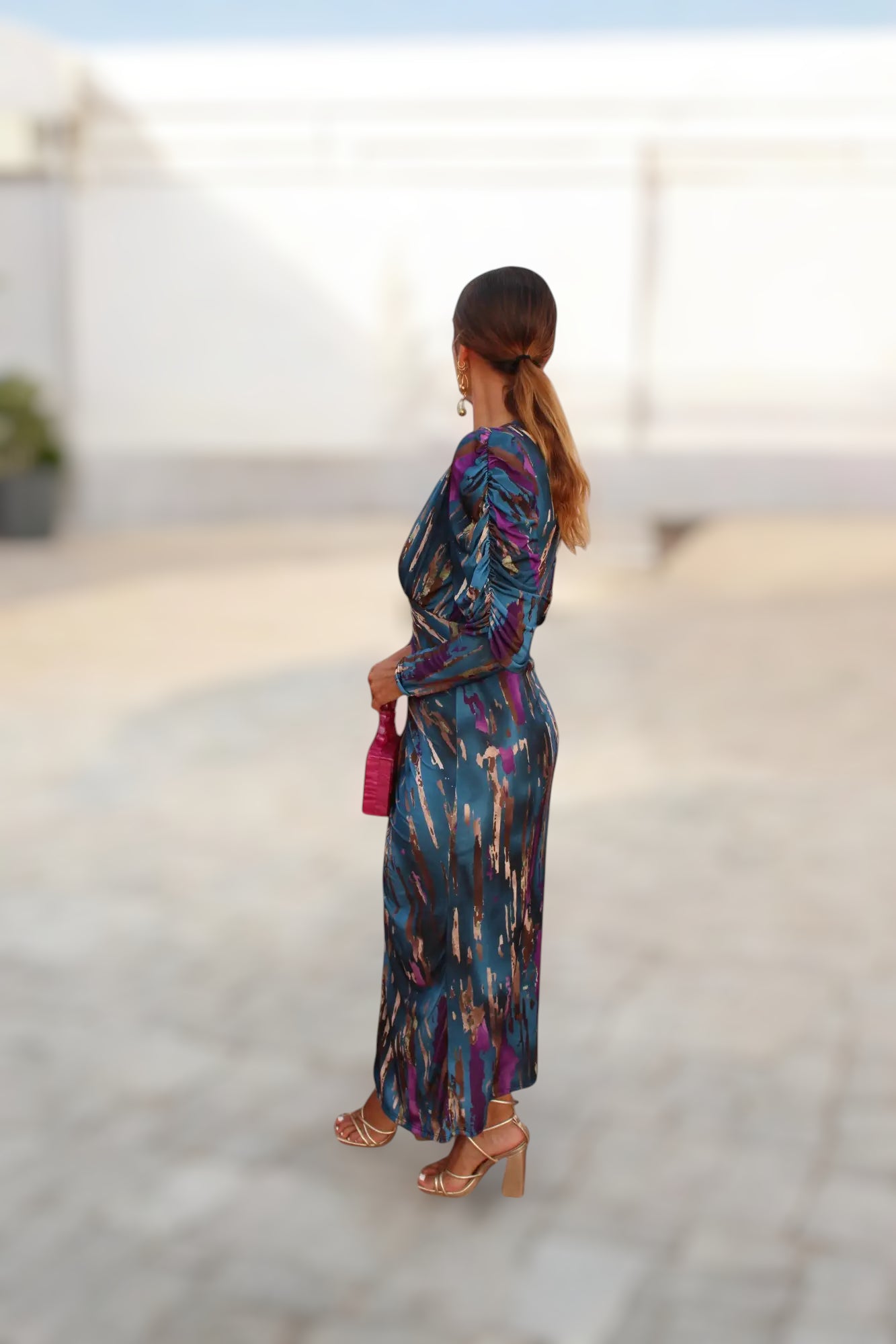 Confeccionado en un tejido satinado de caída ligera, ofrece un movimiento elegante al andar y un tacto suave sobre la piel. Su estampado artístico en tonos azul petróleo, morado y dorado añade un aire moderno y distinguido, ideal para destacar en eventos especiales.