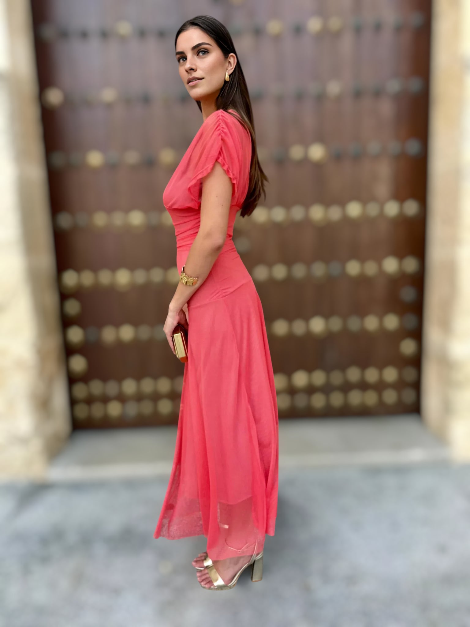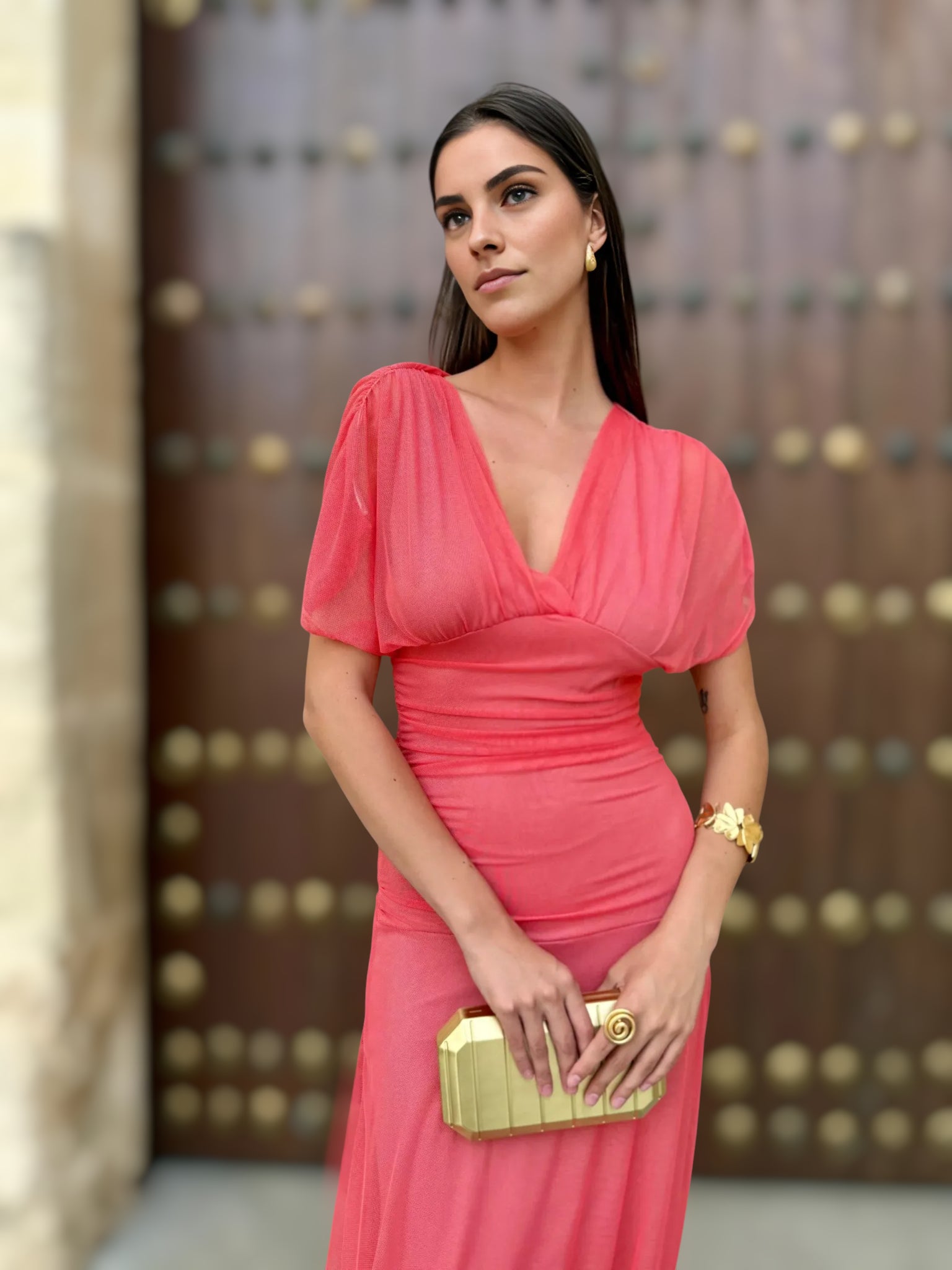 Perfecto como vestido de invitada, de fiesta o para ocasiones especiales, el Vestido Clara Coral es sinónimo de dulzura, estilo y una feminidad radiante que no pasa desapercibida.