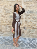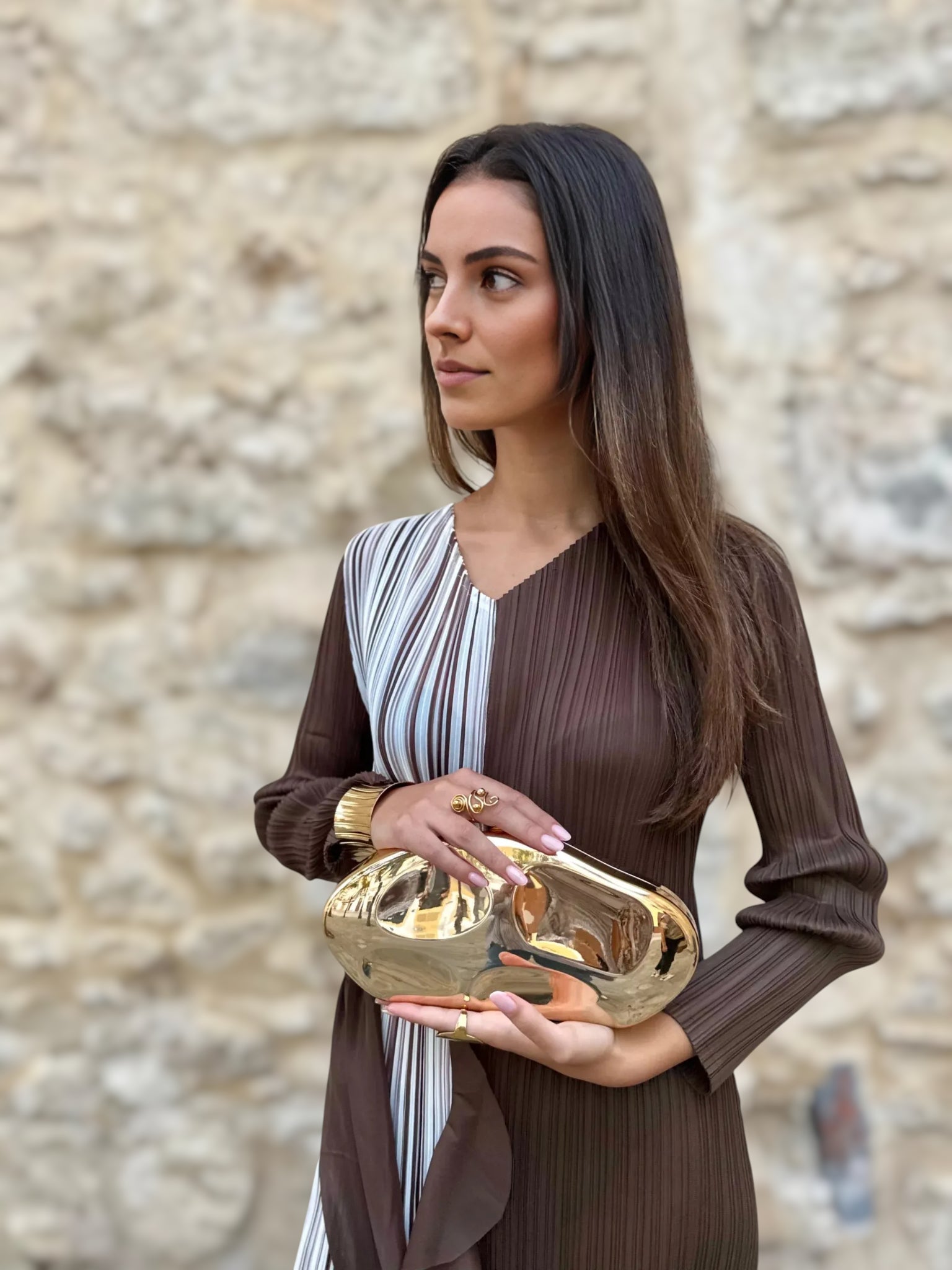 El Vestido Cora es una pieza única que destaca por su diseño original y su elegancia relajada. Combina paneles plisados y estampados a rayas en perfecta armonía, creando un efecto visual moderno y sofisticado.