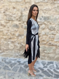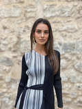 El Vestido Cora es una pieza única que destaca por su diseño original y su elegancia relajada. Combina paneles plisados y estampados a rayas en perfecta armonía, creando un efecto visual moderno y sofisticado.