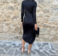 El corte midi con silueta fluida se adapta con naturalidad al cuerpo, mientras que el detalle de volante lateral añade movimiento y feminidad al conjunto. Su escote en “V” y las mangas largas con textura plisada aportan equilibrio entre sencillez y distinción.