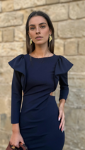 El Vestido Cristina Azul Marino es una prenda de elegancia atemporal que combina estructura, sutileza y sofisticación. Su diseño entallado realza la silueta con delicadeza, mientras que los volantes estructurados sobre los hombros aportan un toque distintivo y moderno que equilibra la figura.