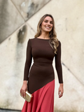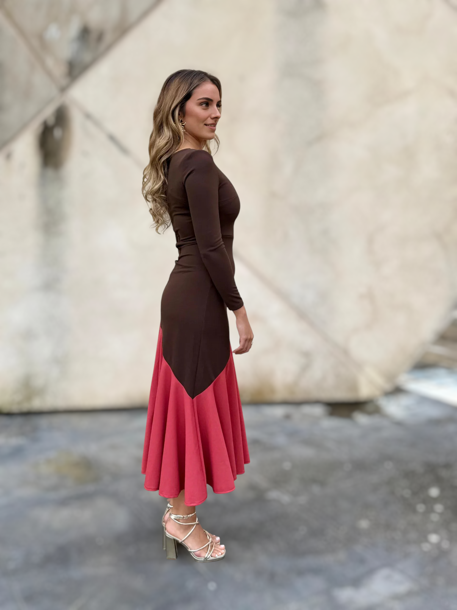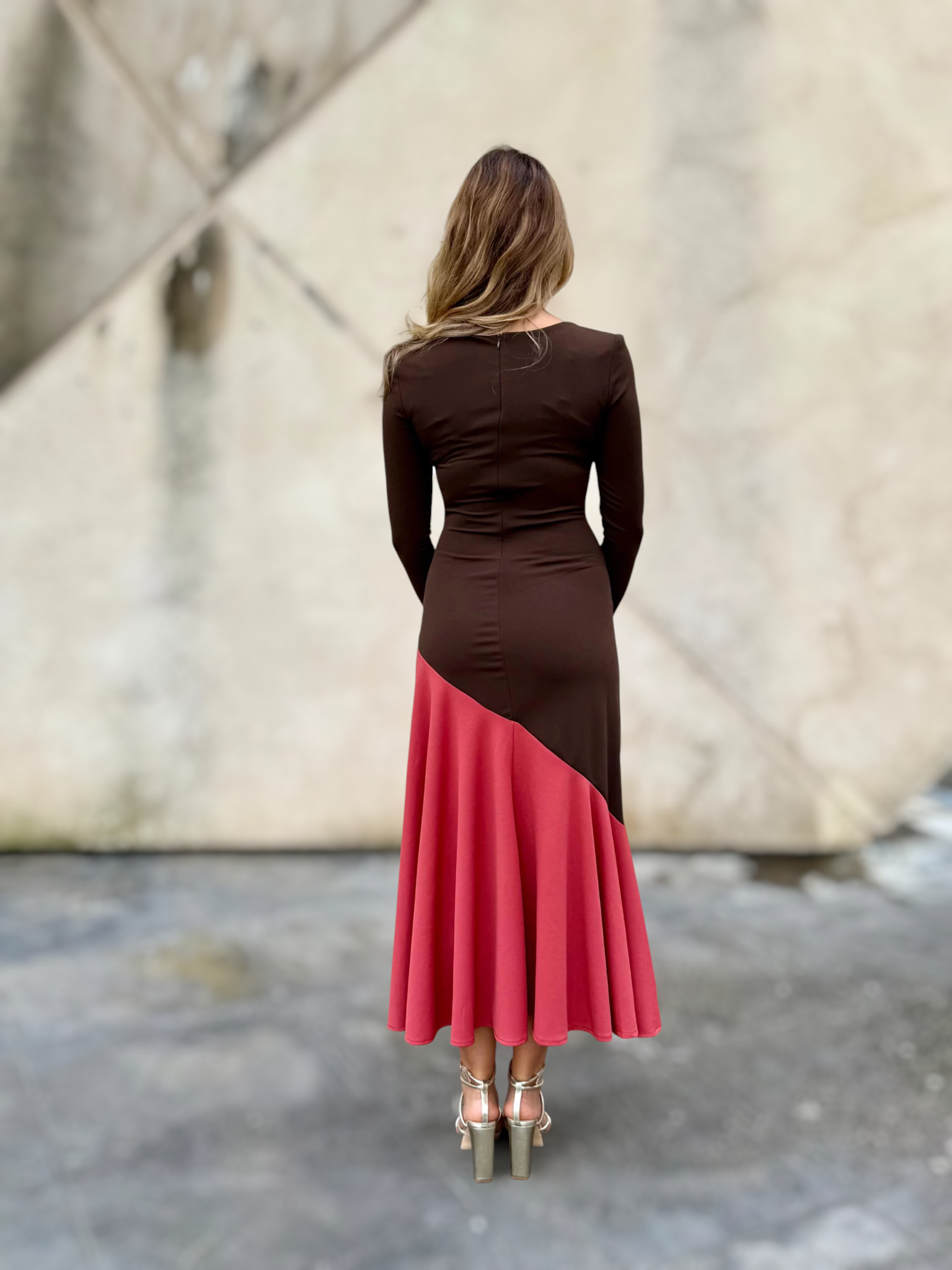 El Vestido Daniela Marrón Coral es una pieza original y elegante que destaca por su diseño bicolor y su silueta femenina. Su corte ajustado en el cuerpo realza la figura con sutileza, mientras que la falda de vuelo con línea diagonal aporta movimiento y un efecto visual estilizado que alarga la silueta con armonía.