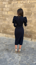 Las mangas abullonadas aportan volumen y equilibrio, creando un contraste armonioso con el corte entallado del cuerpo. Confeccionado en un tejido con cuerpo y ligera elasticidad, este vestido midi se adapta perfectamente a las formas, ofreciendo comodidad y sofisticación.