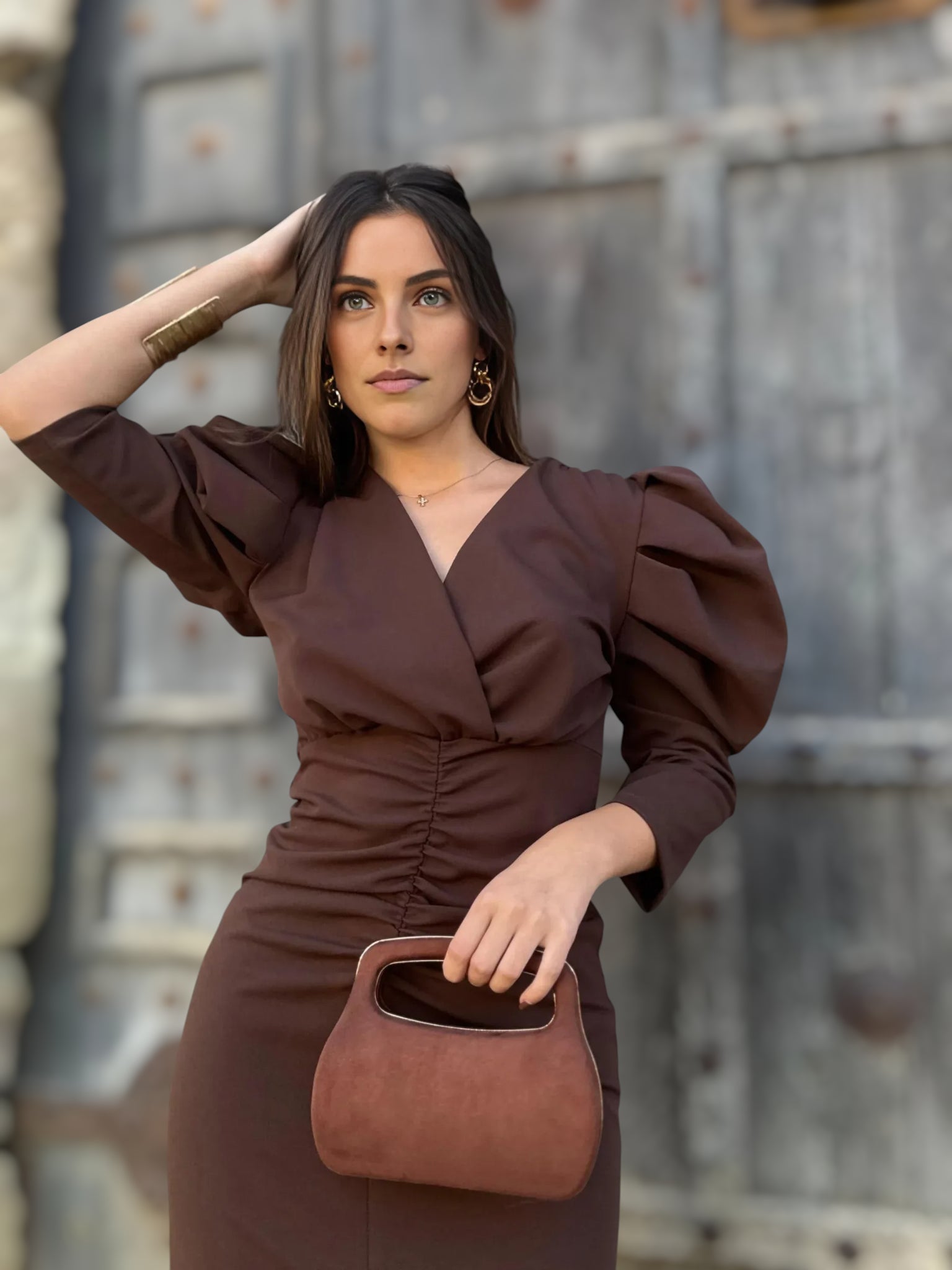 El Vestido Dolores Chocolate es una prenda que combina elegancia y carácter en una silueta estructurada y femenina. Su escote cruzado en pico realza el busto con sutileza, mientras que el frunce central define la cintura y estiliza la figura de forma natural.