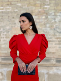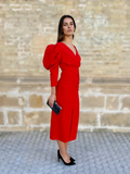 El Vestido Dolores Rojo es una prenda que combina elegancia y carácter en una silueta estructurada y femenina. Su escote cruzado en pico realza el busto con sutileza, mientras que el frunce central define la cintura y estiliza la figura de forma natural.