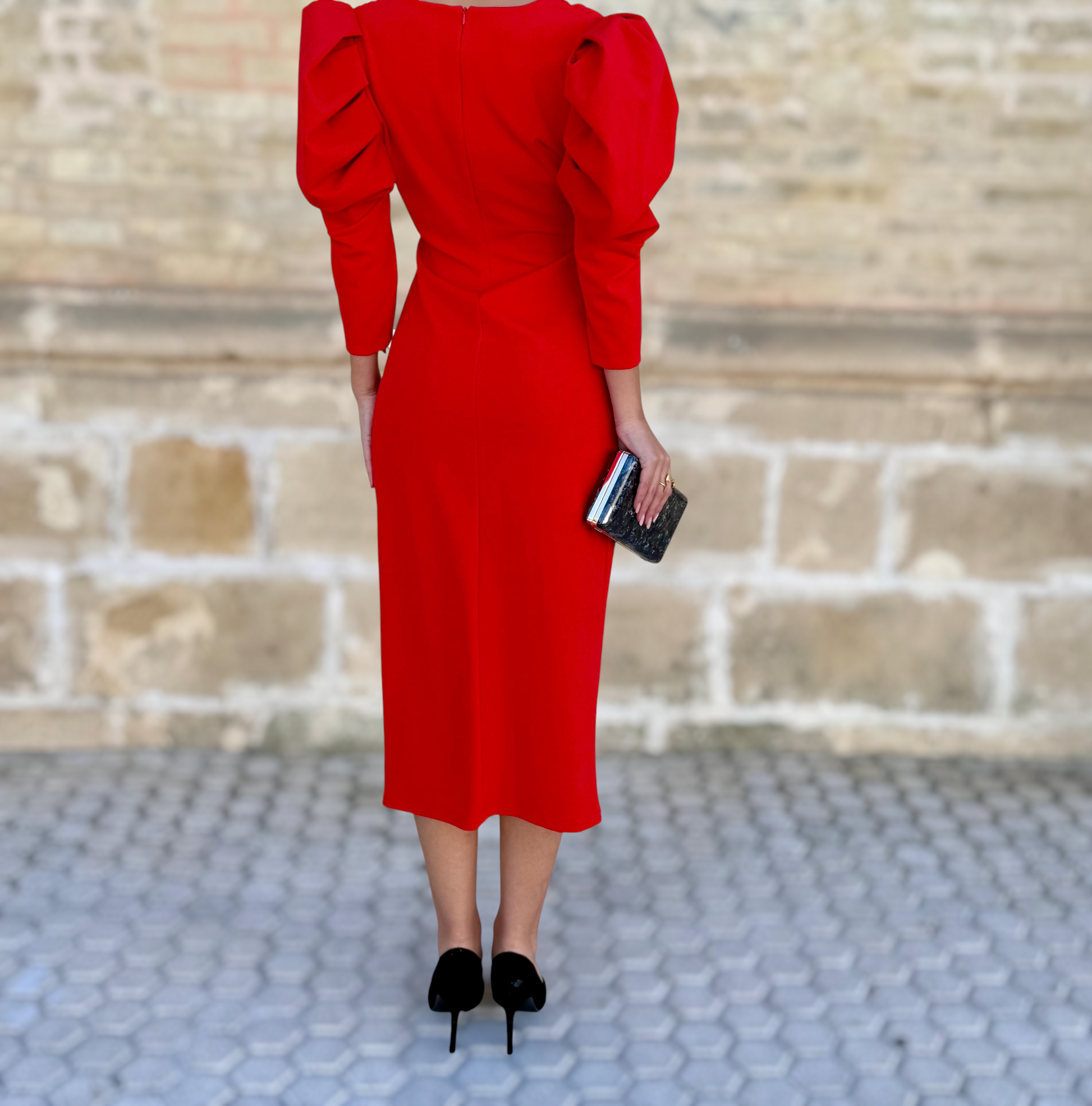 Las mangas abullonadas aportan volumen y equilibrio, creando un contraste armonioso con el corte entallado del cuerpo. Confeccionado en un tejido con cuerpo y ligera elasticidad, este vestido midi se adapta perfectamente a las formas, ofreciendo comodidad y sofisticación.