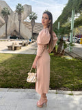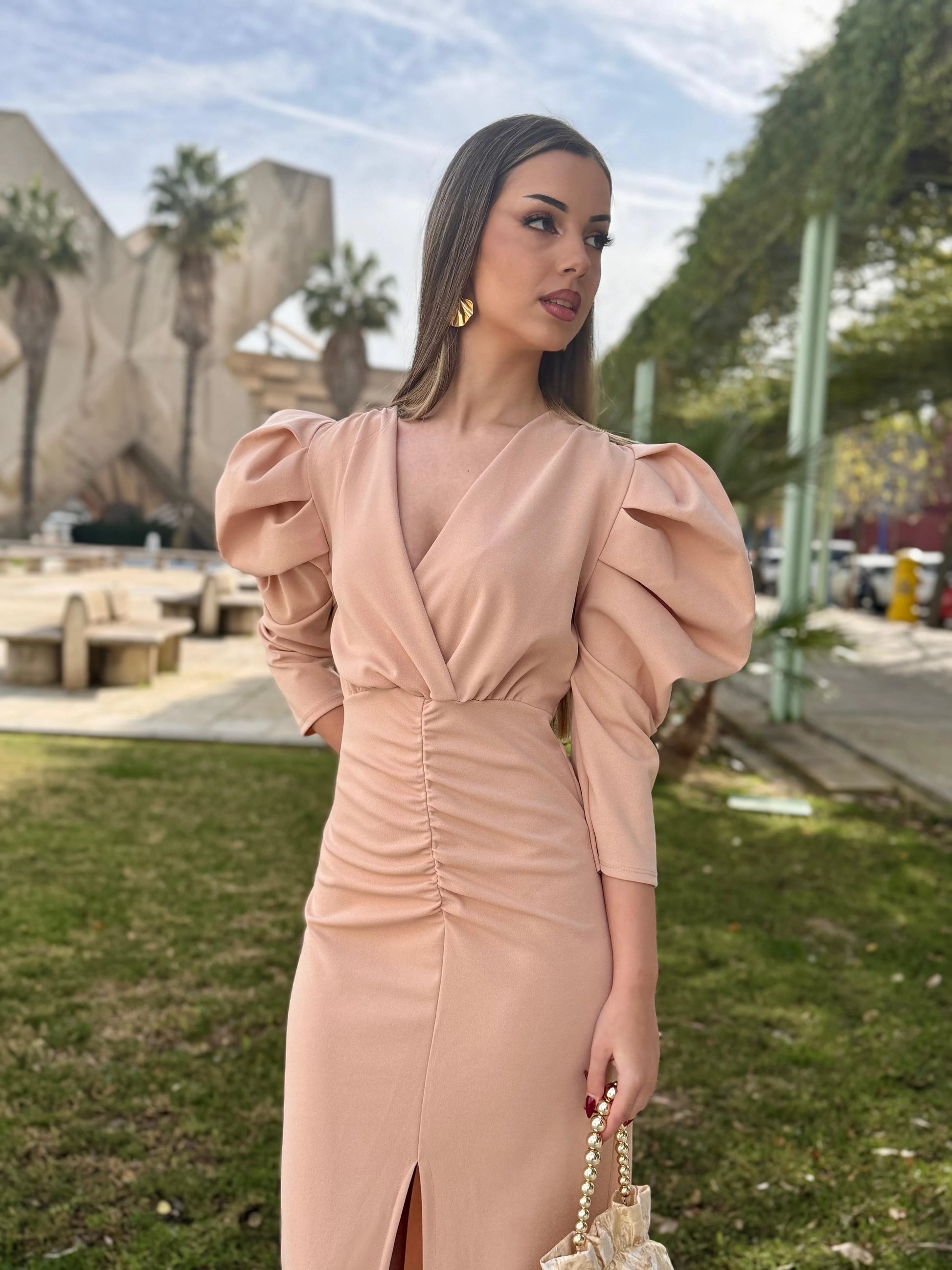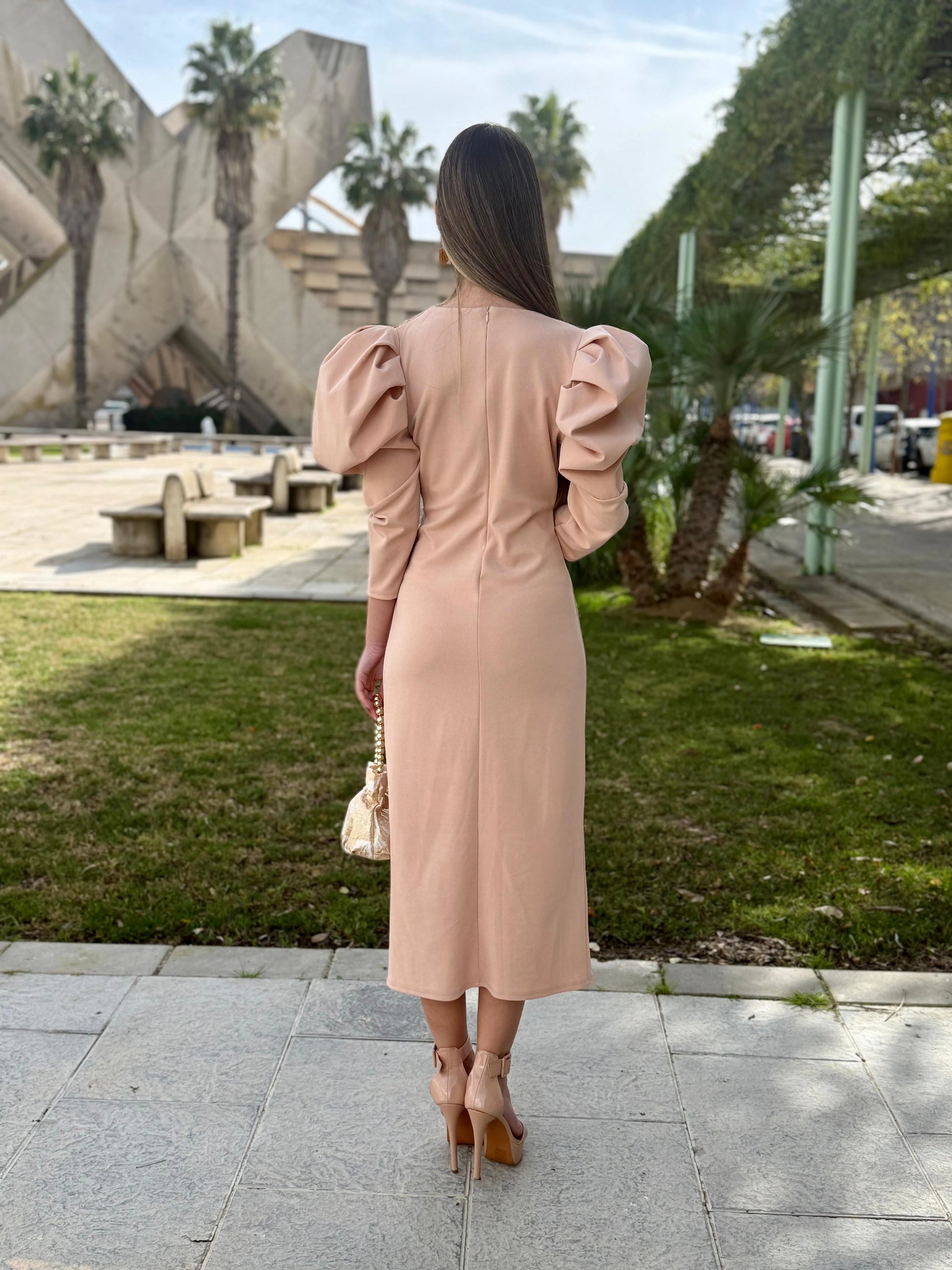 Las mangas abullonadas aportan volumen y equilibrio, creando un contraste armonioso con el corte entallado del cuerpo. Confeccionado en un tejido con cuerpo y ligera elasticidad, este vestido midi se adapta perfectamente a las formas, ofreciendo comodidad y sofisticación.