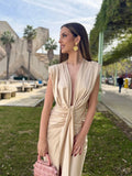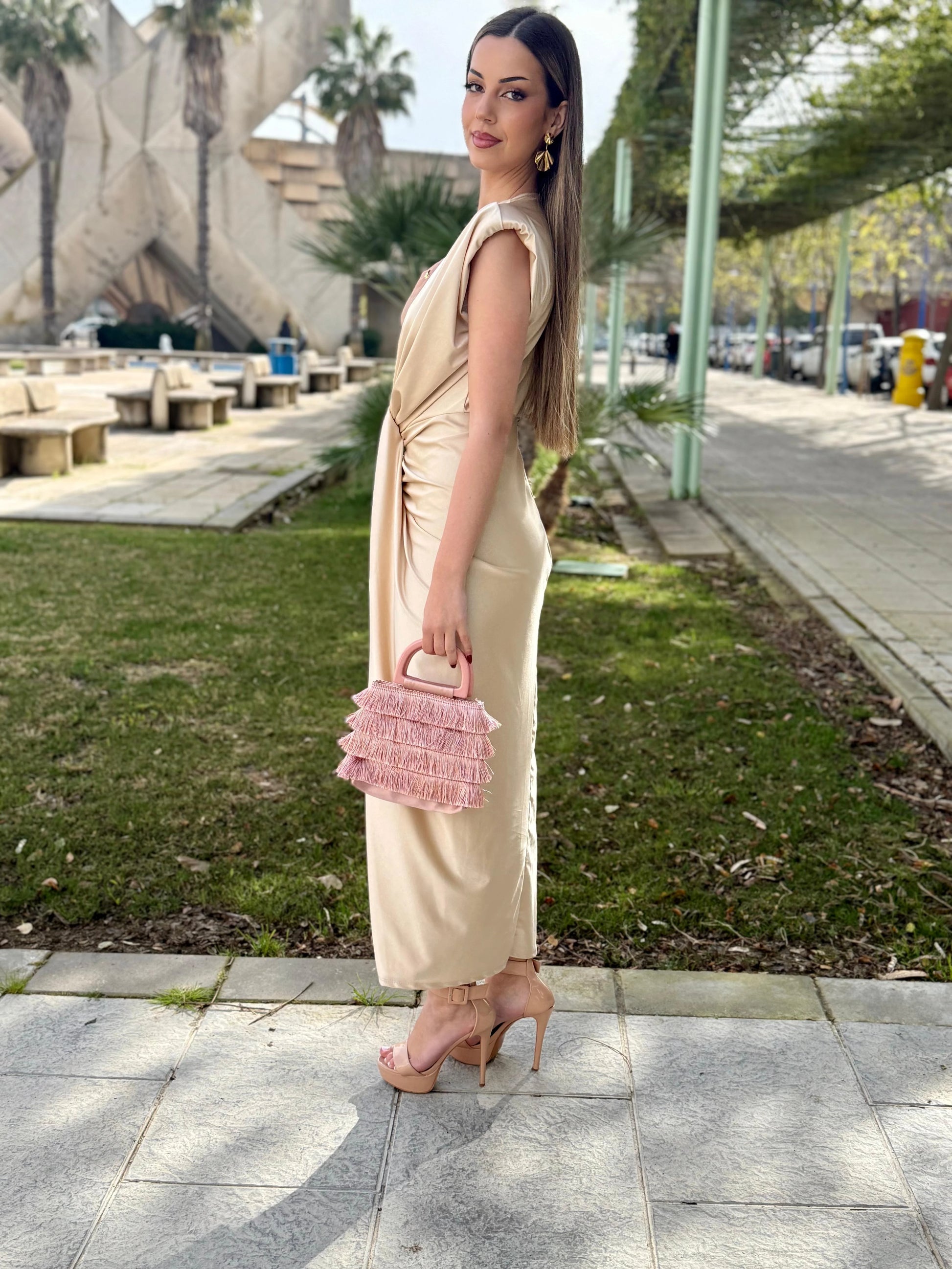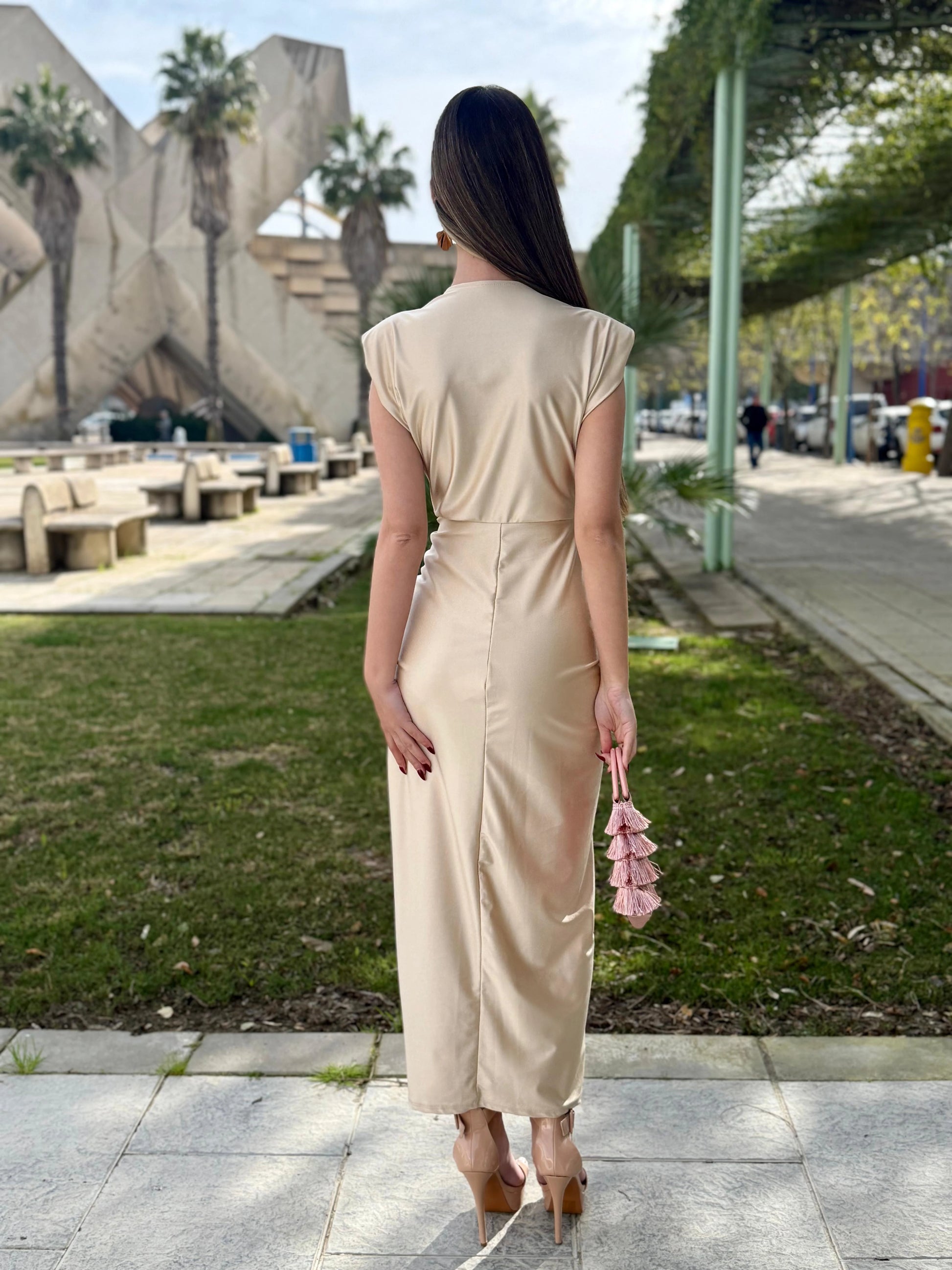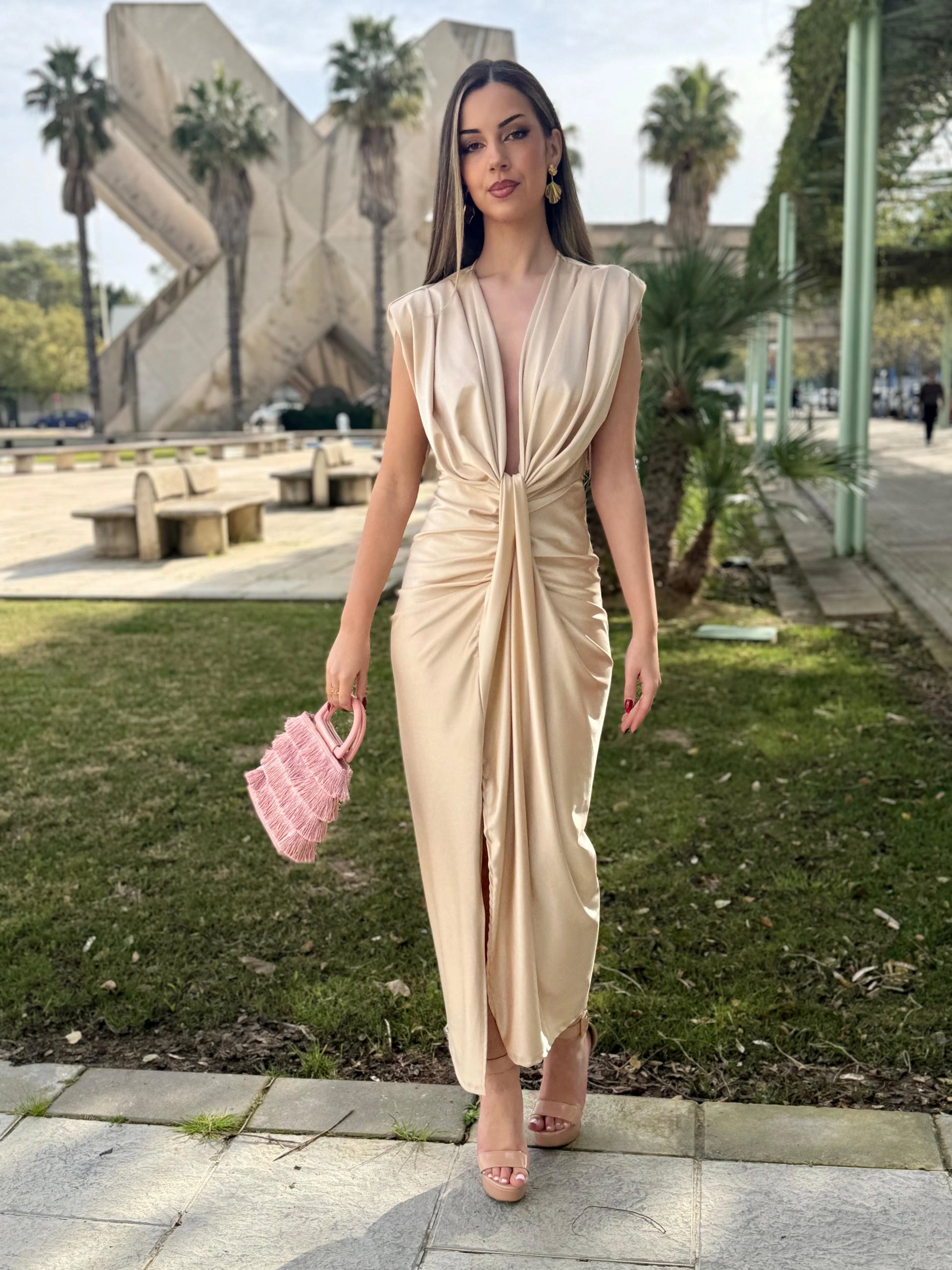 El Vestido Elena Champagne es una prenda deslumbrante y sofisticada que combina fuerza y elegancia en un diseño de líneas fluidas. Su escote profundo con drapeado central realza el busto con sutileza, mientras que el nudo en la cintura define la silueta y aporta un toque escultural y favorecedor.