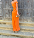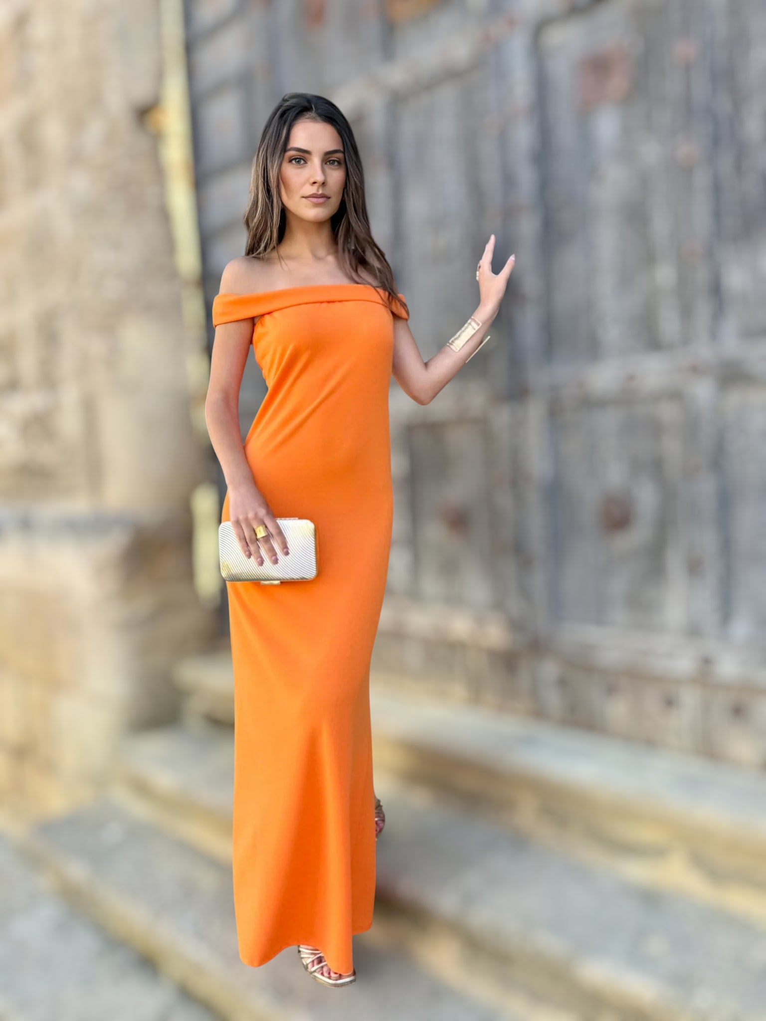 El Vestido Elsa Naranja es una prenda que irradia elegancia y vitalidad, perfecta para destacar con estilo en cualquier evento especial. Su escote bardot realza los hombros y el cuello con sutileza, aportando un toque sofisticado y femenino que equilibra sensualidad y delicadeza.