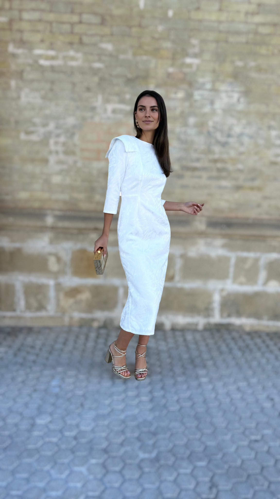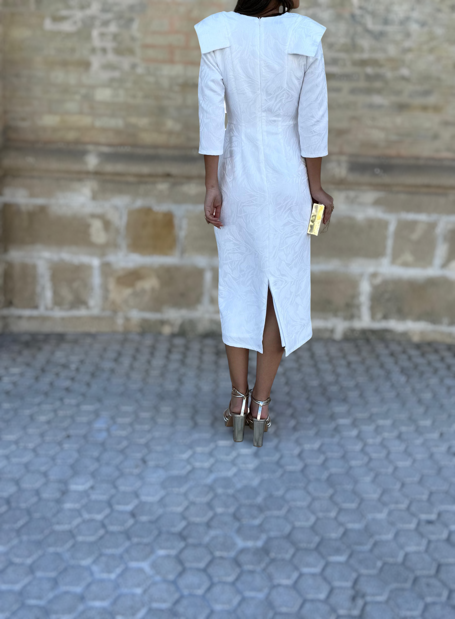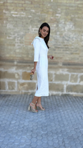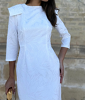 El Vestido Estela Blanco es una pieza exquisita que destaca por su elegancia estructurada y su diseño limpio y sofisticado. Su tejido con sutil relieve floral aporta una textura delicada y luminosa, realzando la silueta con un acabado muy refinado.