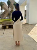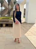 La falda de largo midi y caída fluida aporta movimiento y equilibrio, creando un conjunto armonioso, favorecedor y muy versátil. Su diseño depurado y su combinación de tonos suaves lo convierten en una opción ideal para quienes buscan un look refinado, cómodo y con mucho estilo.