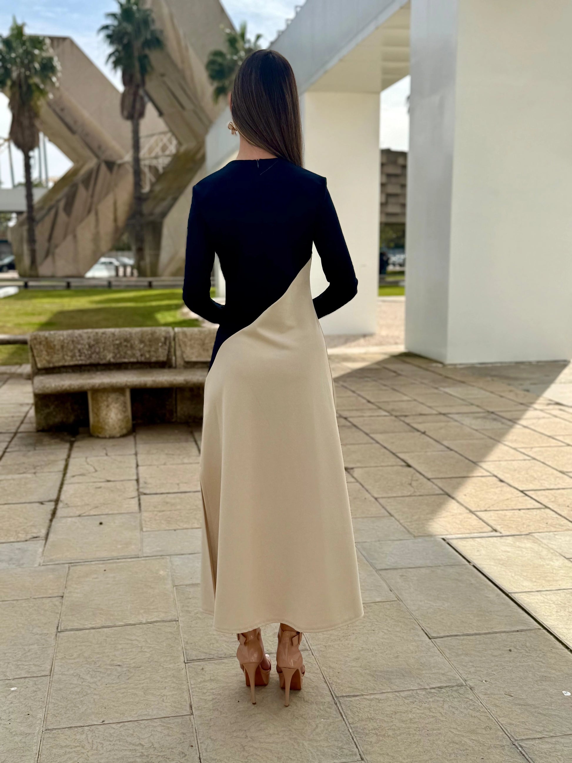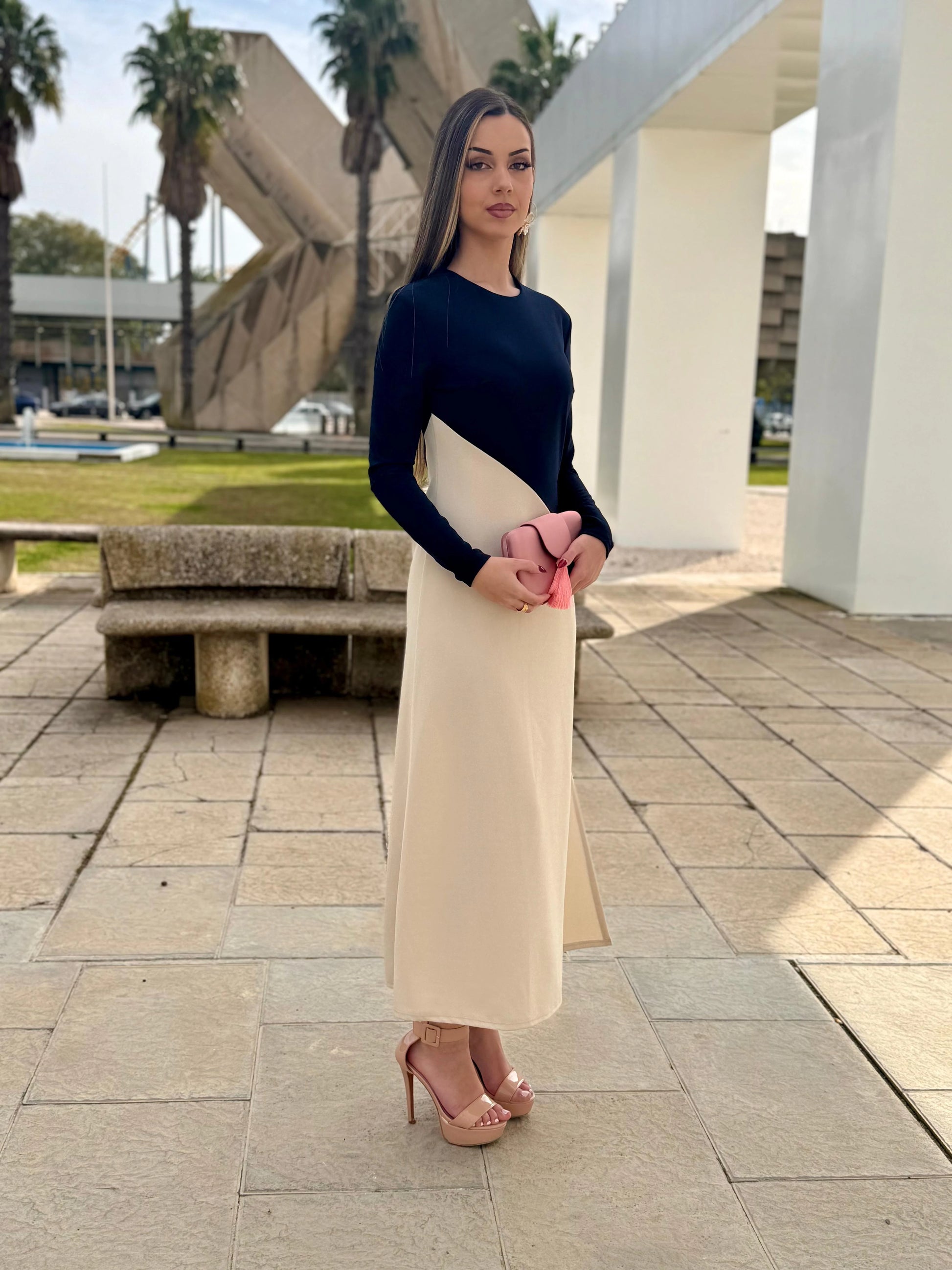 El vestido Faria cen crema y rosa empolvado es una prenda que combina elegancia y delicadeza en una silueta limpia y femenina. Su cuerpo de manga larga y escote cerrado aporta un aire sofisticado y discreto, mientras que el corte diagonal entre colores estiliza la figura y realza la cintura de forma sutil.