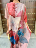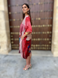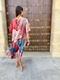 El estampado floral en tonos teja, negro y verde suave crea un efecto degradado lleno de armonía y originalidad, ideal para quienes buscan una prenda diferente y con personalidad. Las mangas amplias tres cuartos y el largo por la rodilla hacen de este vestido una opción versátil y favorecedora.