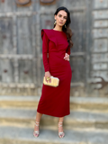 El color burdeos profundo transmite elegancia y carácter, convirtiendo este diseño en una elección perfecta para invitadas que buscan destacar con distinción y clase.