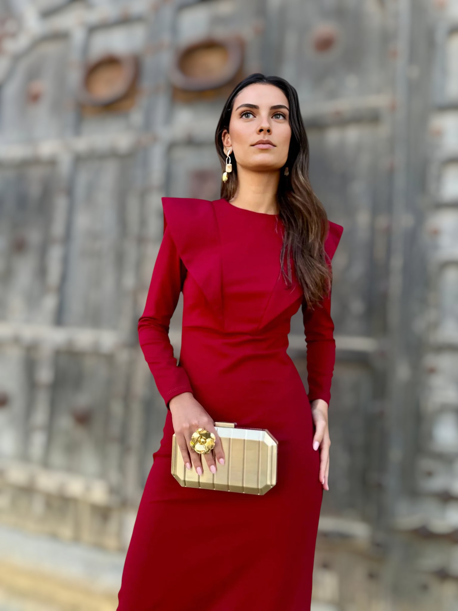 El Vestido Inés Burdeos es una pieza de elegancia atemporal que combina estructura, estilo y sofisticación. Su diseño entallado realza la silueta con sutileza, mientras que el detalle de volantes sobre los hombros aporta un toque arquitectónico y moderno que equilibra el conjunto con fuerza y feminidad.