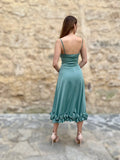 El Vestido Iris Verde es una prenda que combina elegancia atemporal y un toque de modernidad. Su diseño de tirantes finos y su escote sutilmente drapeado realzan el cuello y los hombros con delicadeza, aportando un aire femenino y sofisticado.