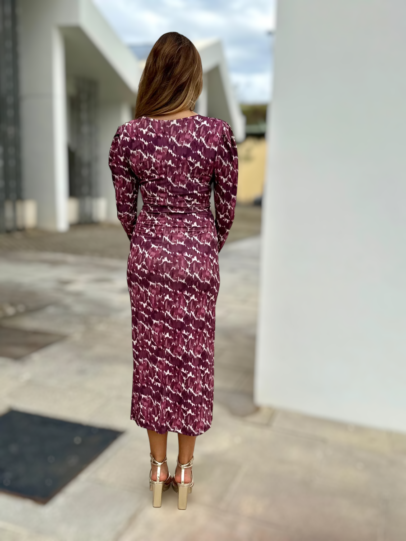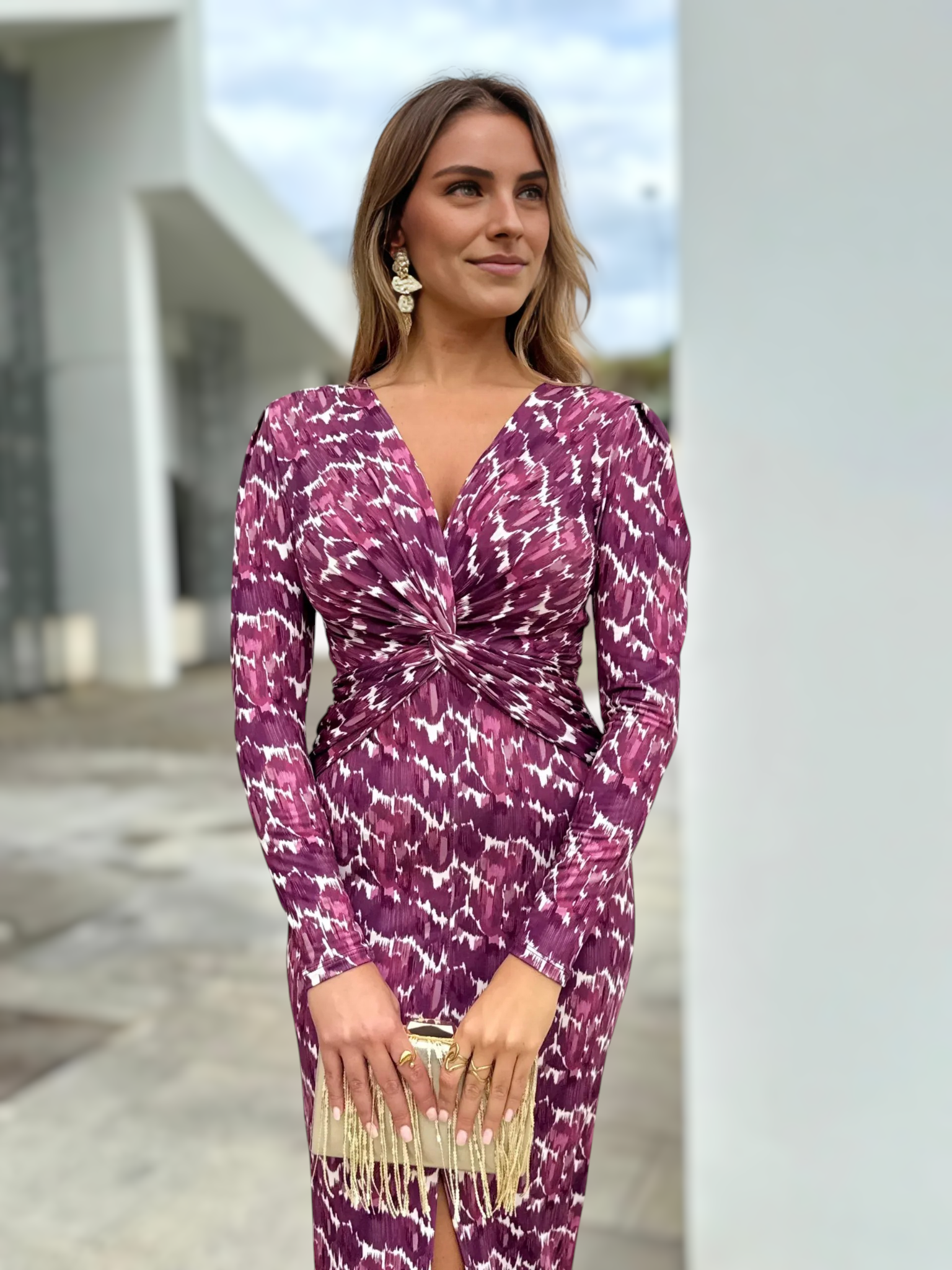 El Vestido Jimena es una pieza elegante y sofisticada que combina dinamismo y estilo en un diseño lleno de movimiento. Su escote en pico cruzado realza el busto con sutileza, mientras que el nudo drapeado en la cintura estiliza la silueta y crea un efecto visual favorecedor.