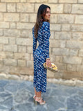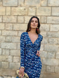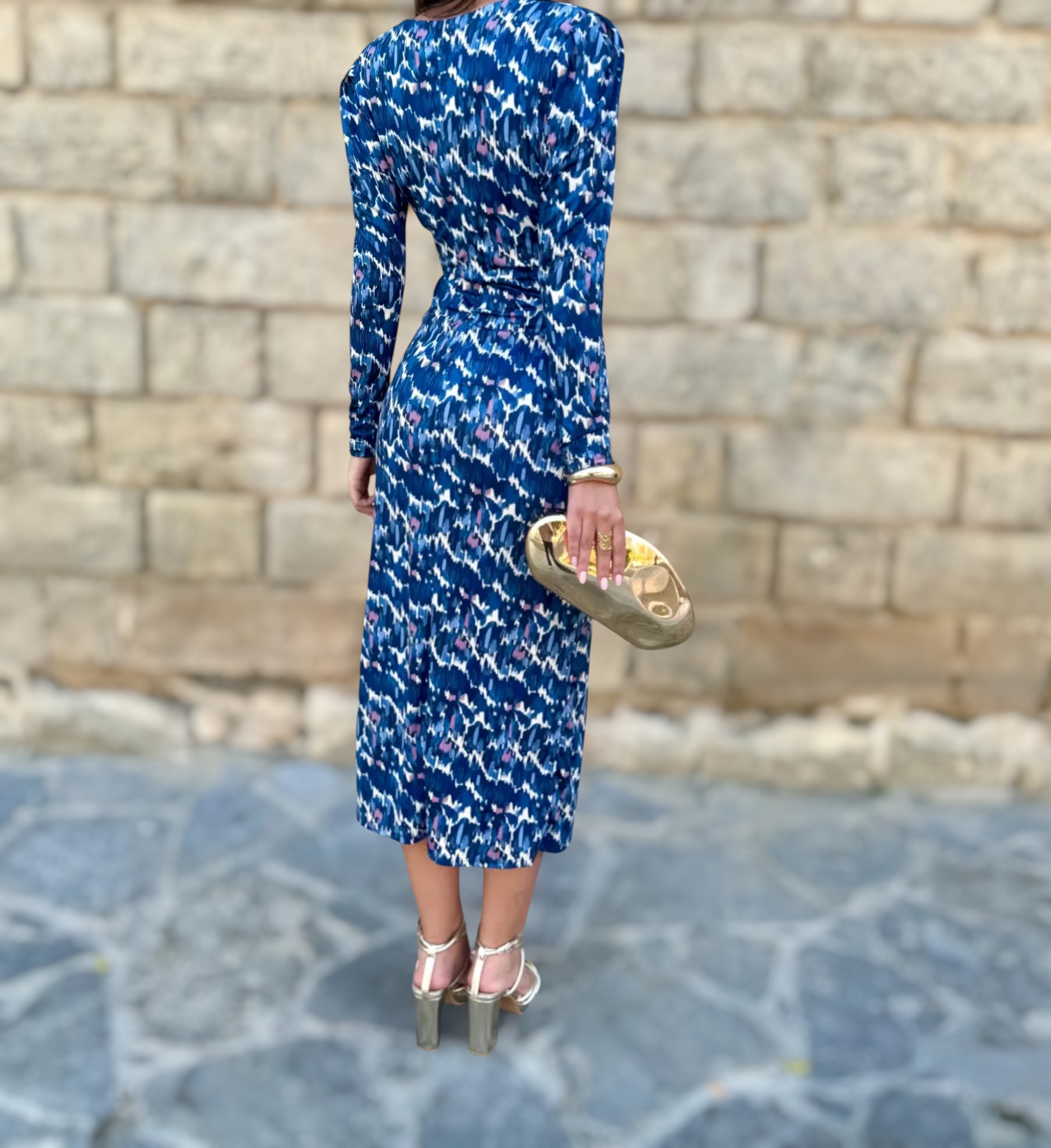 El tono azul predominante transmite serenidad y sofisticación, equilibrado con los matices del estampado que añaden personalidad y originalidad al conjunto.
