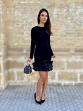 Confeccionado en un tejido con cuerpo y elasticidad, se adapta perfectamente al cuerpo manteniendo una forma impecable. Las mangas largas equilibran la silueta y añaden un toque refinado, ideal para los eventos de otoño e invierno.