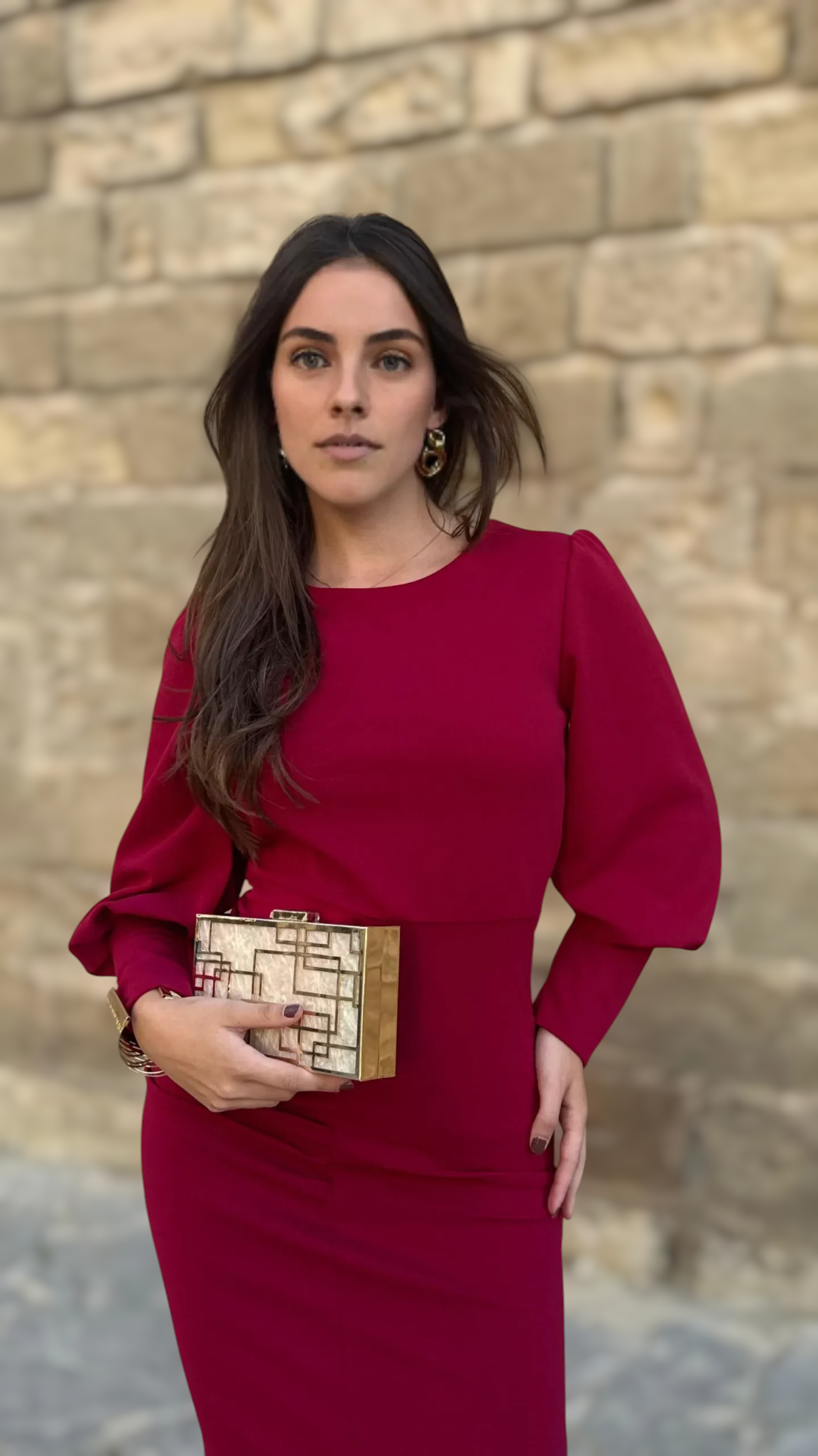 El Vestido Laura Granate es una pieza elegante y atemporal que combina feminidad y sofisticación en un diseño favorecedor. Su cuello redondo y las mangas abullonadas aportan un aire refinado y moderno, mientras que el frunce lateral define la cintura y realza la silueta con sutileza.