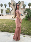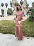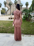 La parte superior entallada realza la silueta con sutileza, mientras que la falda de largo maxi y caída fluida aporta movimiento y equilibrio al conjunto. Confeccionado en un tejido suave y adaptable, este diseño resulta cómodo, elegante y perfecto para quienes buscan un look especial con un acabado sofisticado y muy favorecedor.