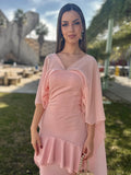 Los detalles de volantes en la falda añaden movimiento y personalidad, creando un conjunto armonioso y con mucha presencia. Confeccionado en un tejido de caída suave, este vestido se adapta al cuerpo con elegancia y resulta ideal para quienes buscan un look refinado, romántico y diferente.