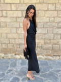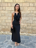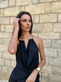 El Vestido Marieta Negro es una propuesta elegante y sofisticada que combina sensualidad y distinción en partes iguales. Su escote drapeado halter con detalle dorado en el cuello enmarca el rostro con un toque de luz y modernidad, aportando equilibrio entre glamour y minimalismo.