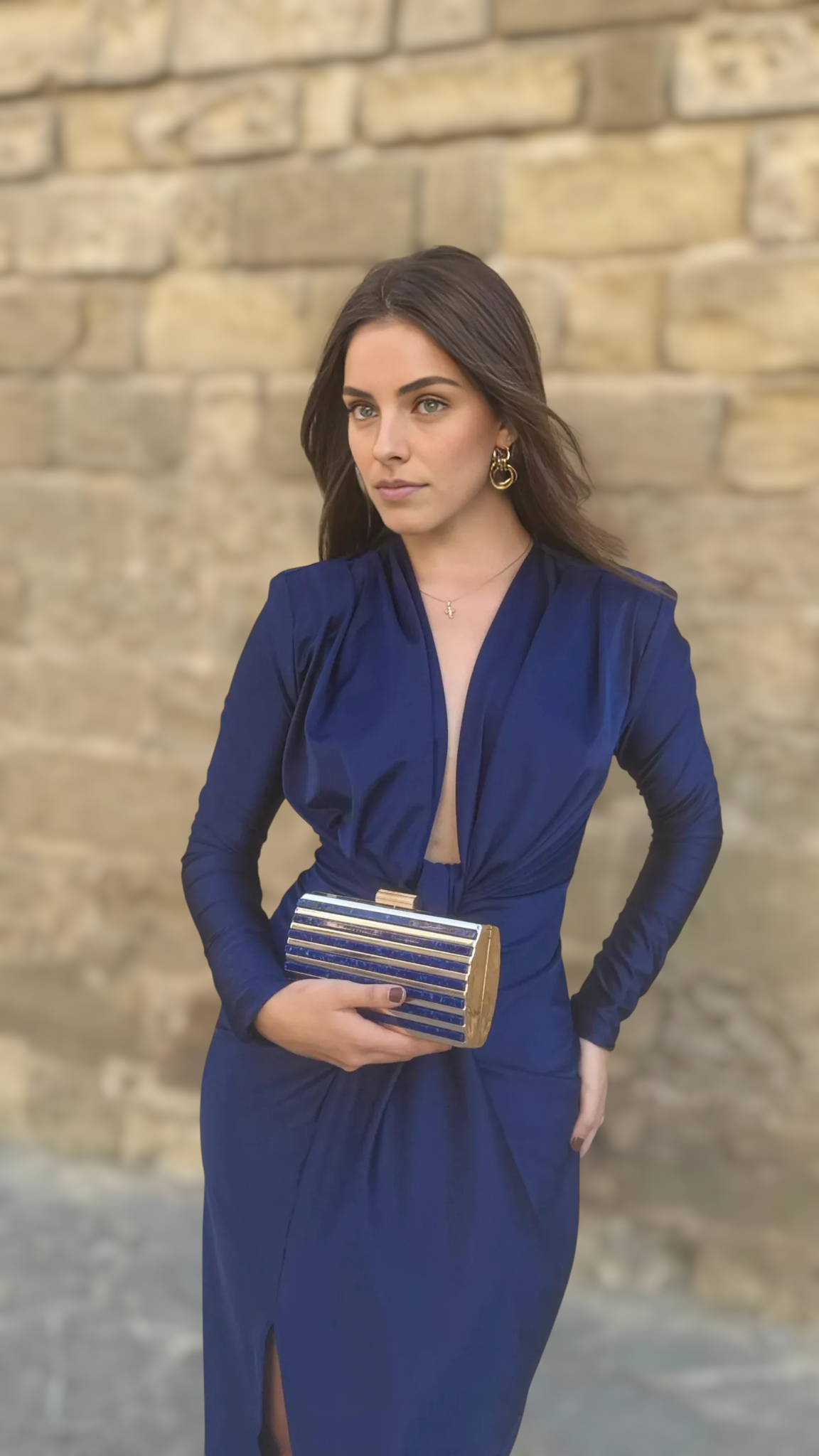 El Vestido Marta color azul klein es una prenda que combina elegancia y modernidad en una silueta envolvente y favorecedora. Su escote profundo en pico aporta un toque de sensualidad equilibrada, mientras que el frunce central define la cintura y realza la figura con un efecto visual estilizador.