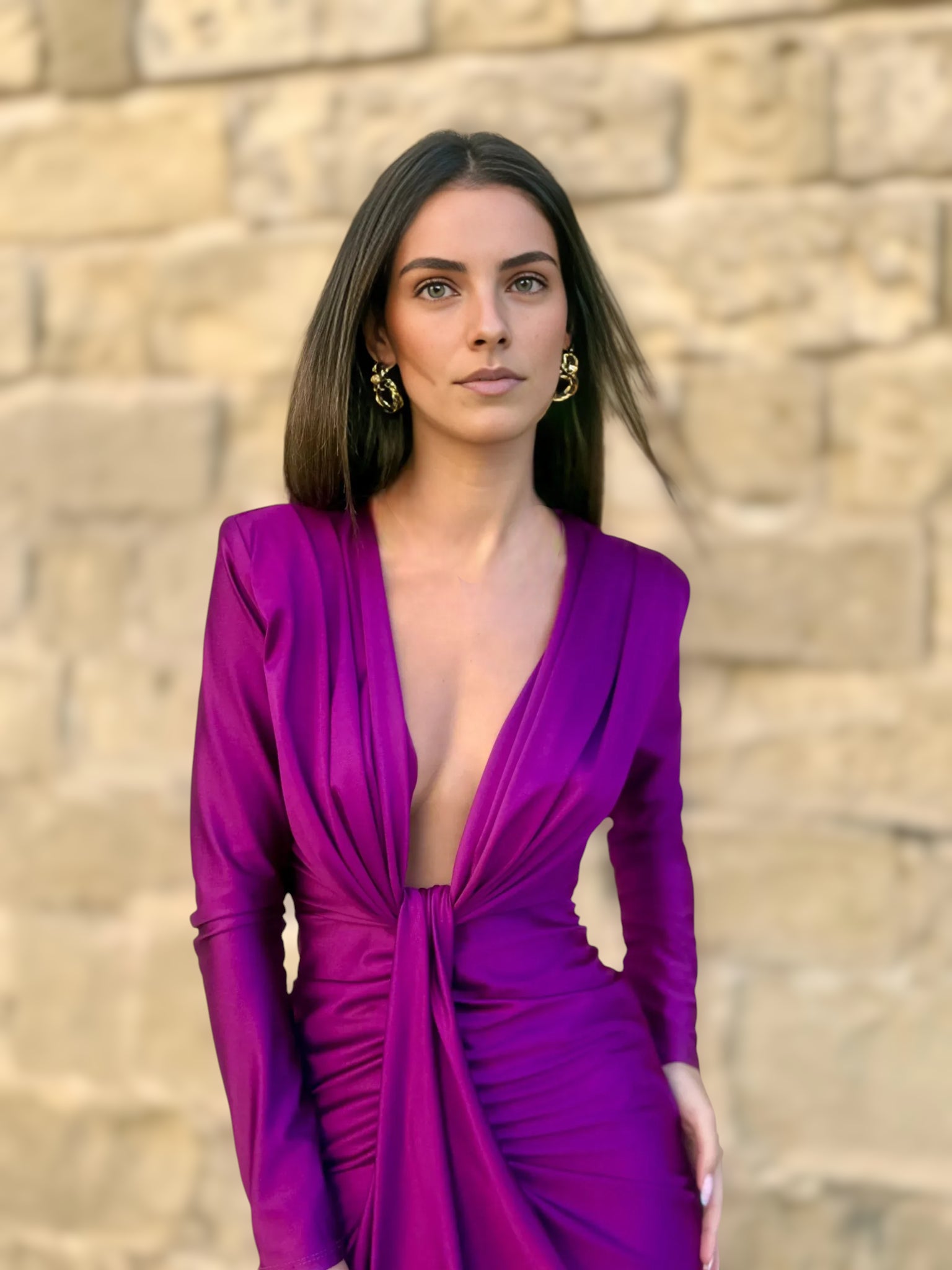 El Vestido Marta color buganvilla es una prenda que combina elegancia y modernidad en una silueta envolvente y favorecedora. Su escote profundo en pico aporta un toque de sensualidad equilibrada, mientras que el frunce central define la cintura y realza la figura con un efecto visual estilizador.